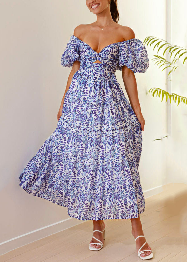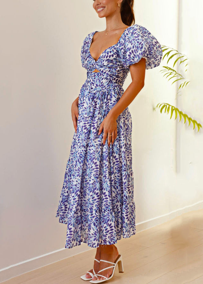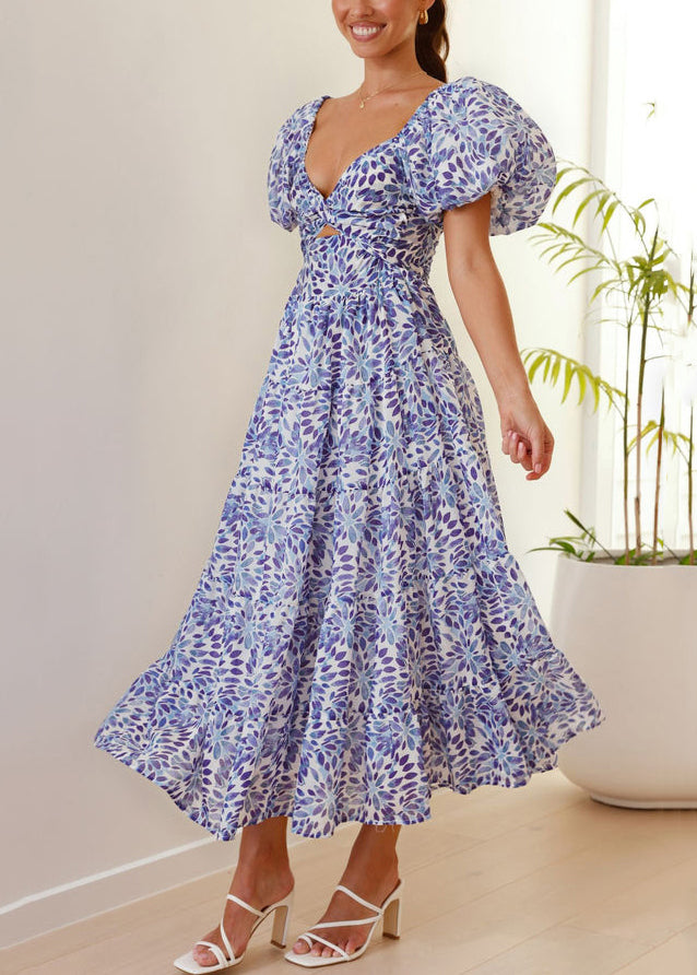 French Purple V Neck Print Cotton Dress Puff Sleeve