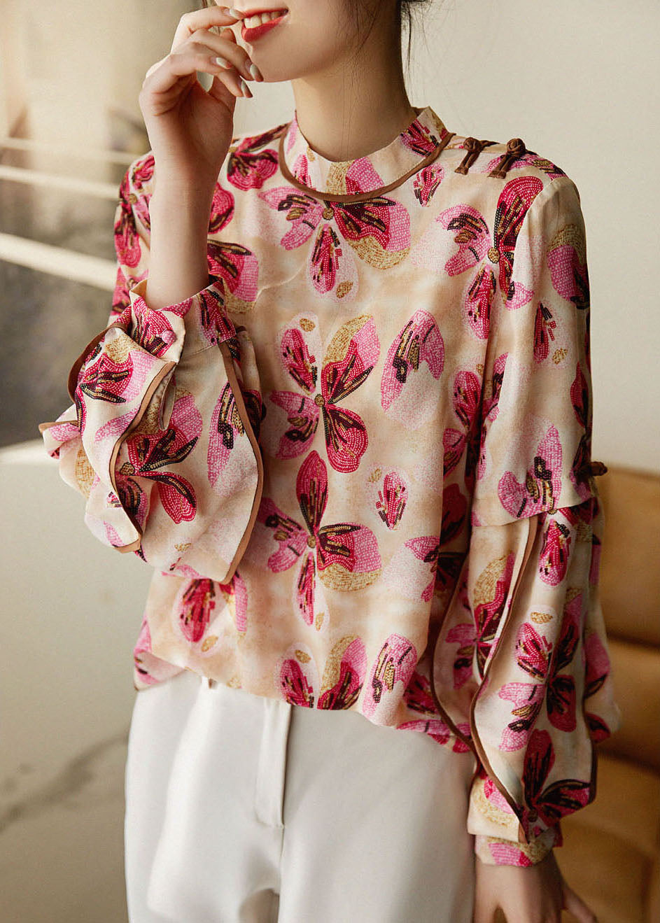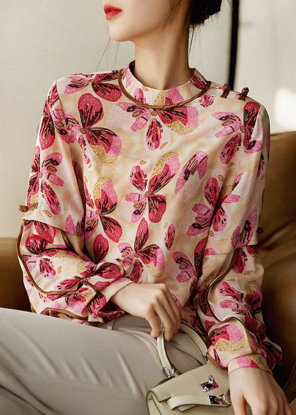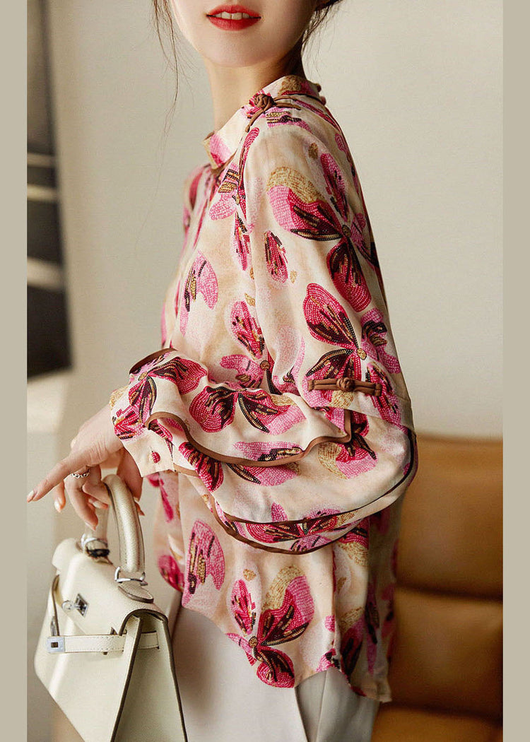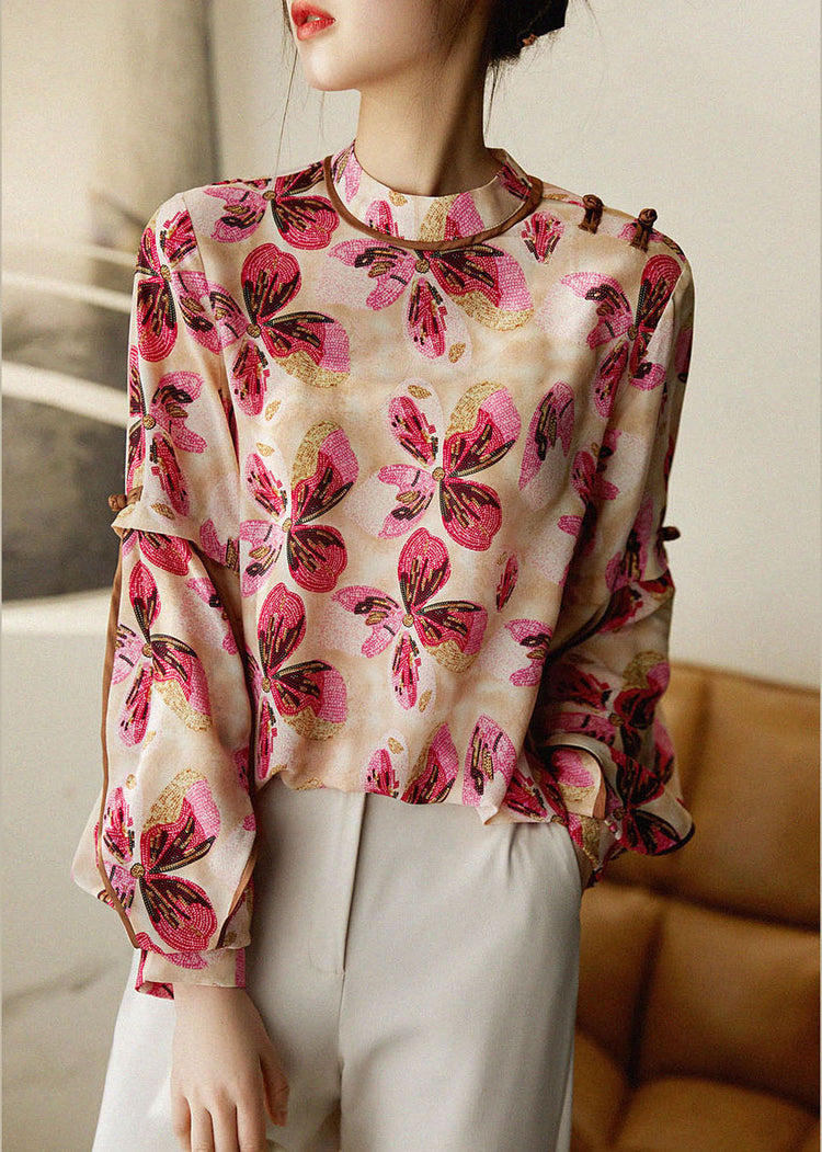 French Red button Stand Collar print Patchwork Chiffon Shirt Tops Spring