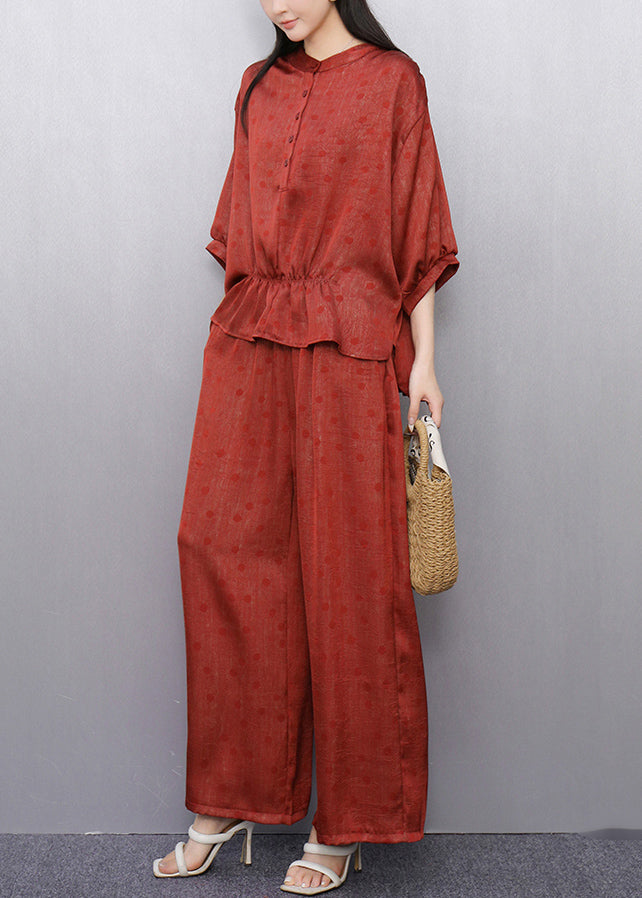 French Red Dot Tops And Wide Leg Pants Cotton Two Pieces Set Half Sleeve