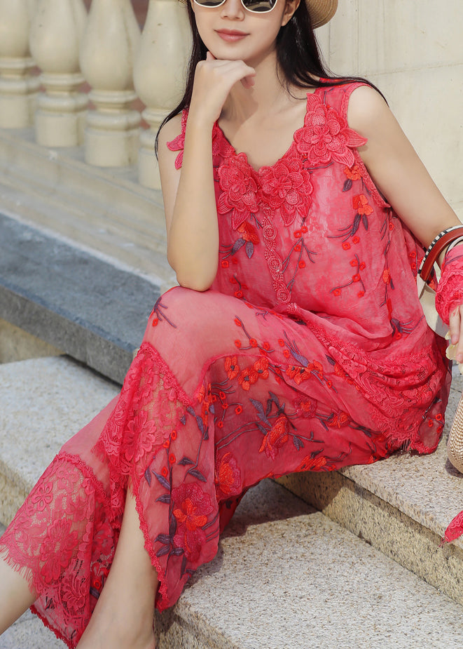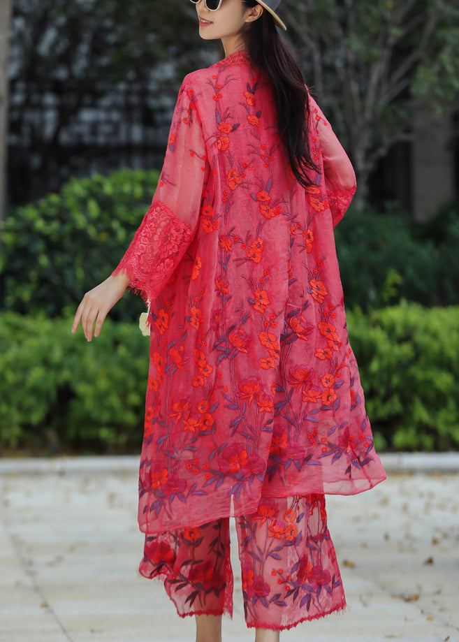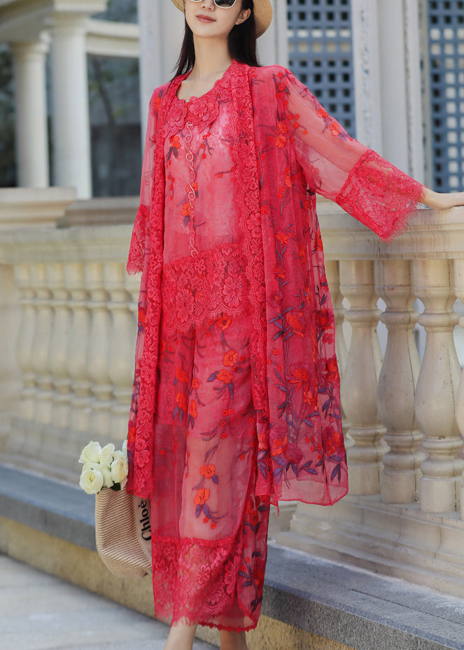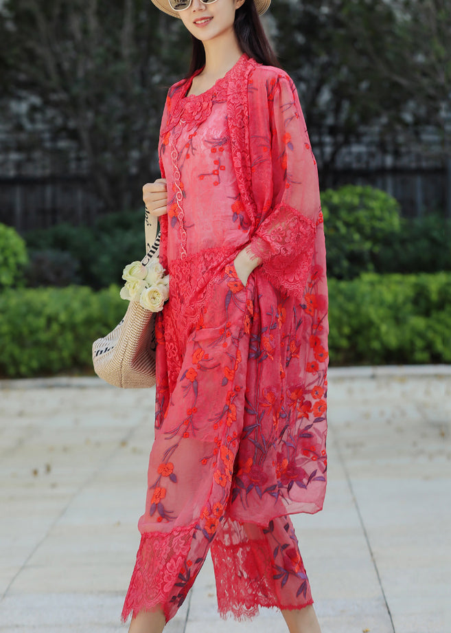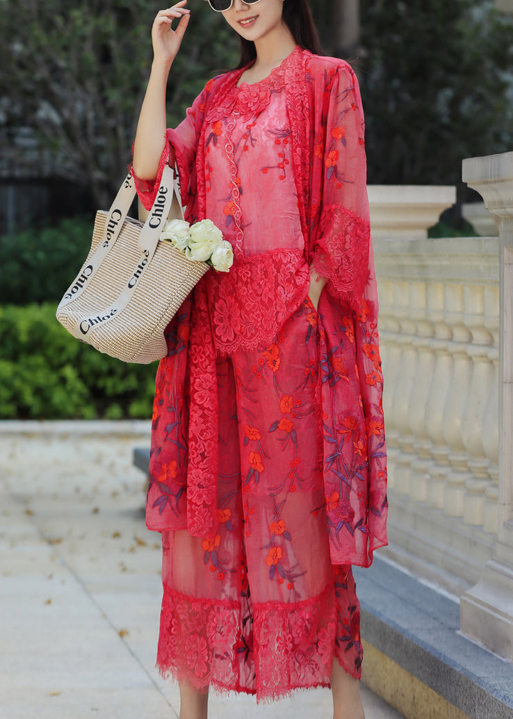 French Red Embroidered Pockets Lace Patchwork Three Pieces Set Spring