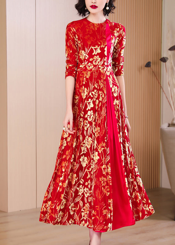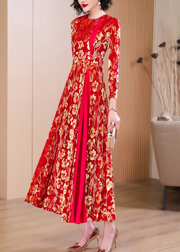 French Red Print Hollow Out Wrinkled Silk Velvet Long Dresses Fall
