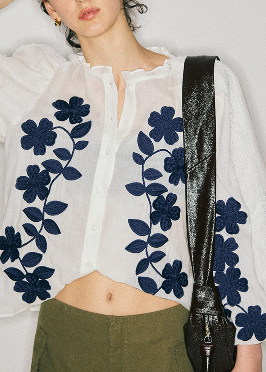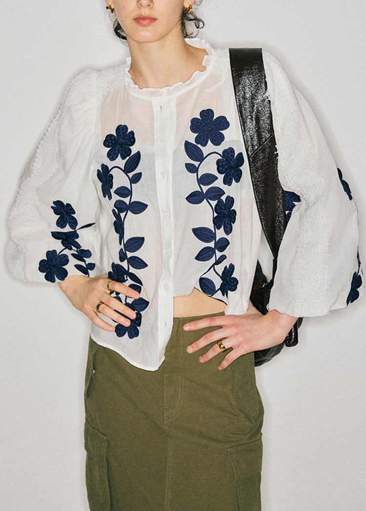 French Red Ruffled Lace Embroidered Cotton Shirt Top Fall