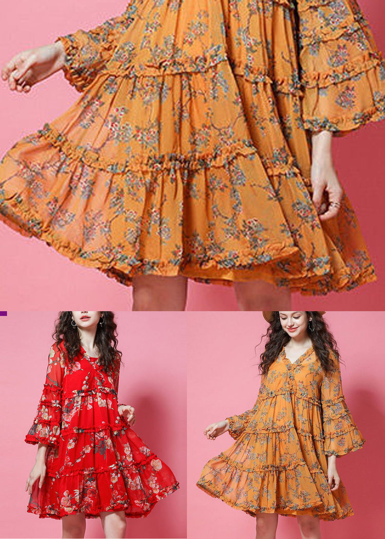 French Red Ruffled Print Chiffon Maxi Dress Bracelet Sleeve