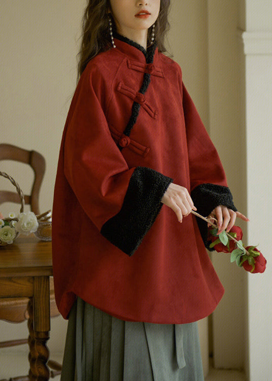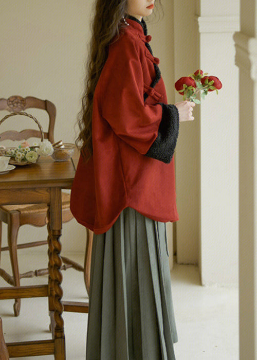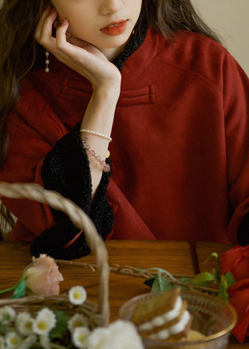French Red Stand Collar Button Warm Fleece Tops Long Sleeve