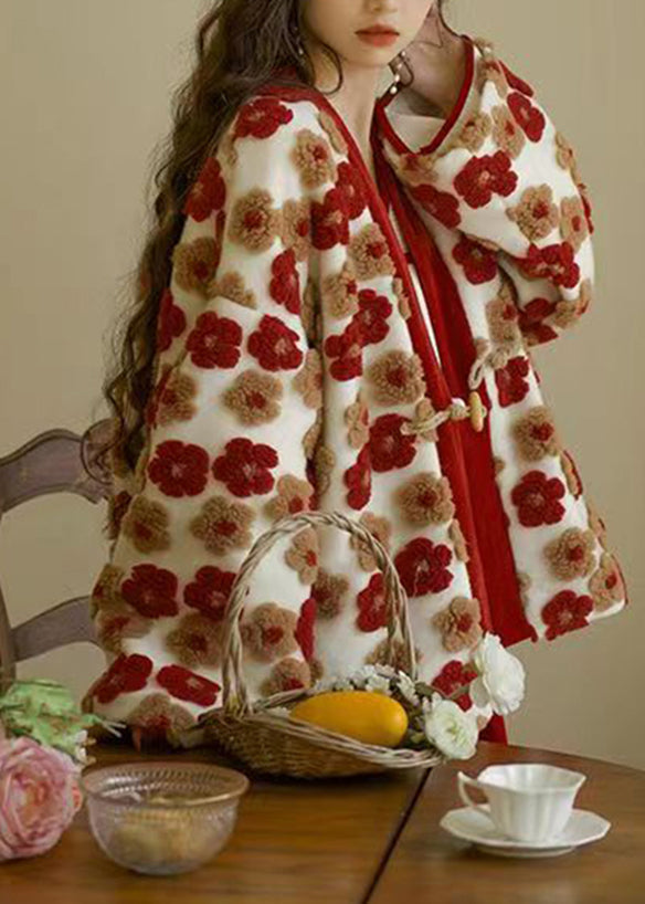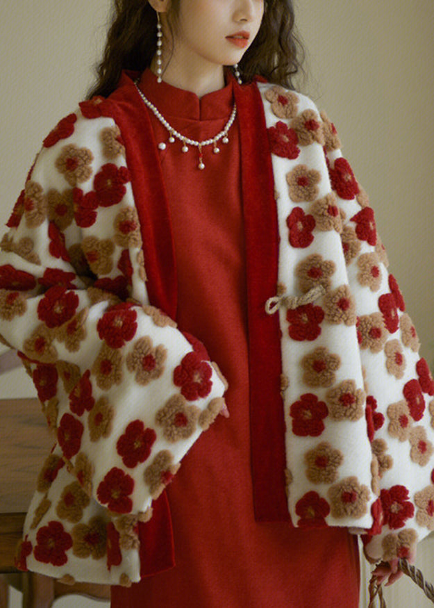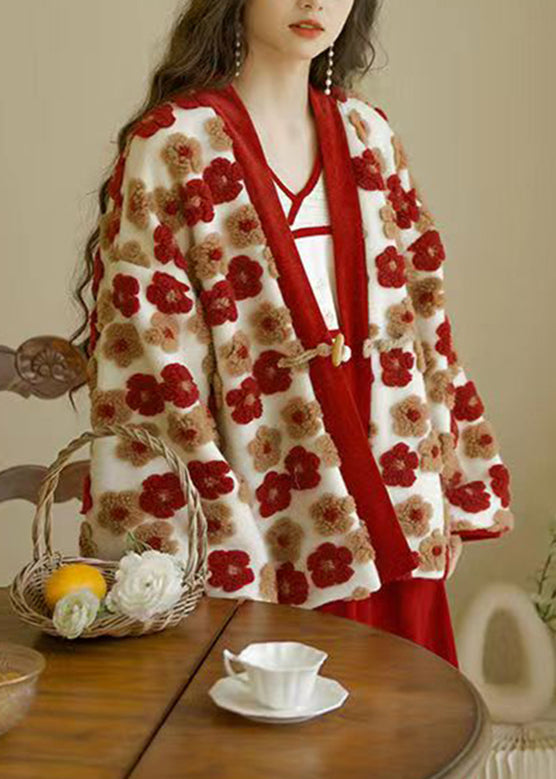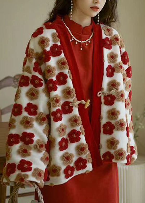 French Red V Neck Floral Warm Coat Winter