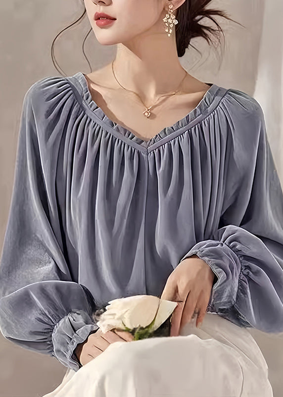French Red V Neck Wrinkled Silk Velour Top Lantern Sleeve