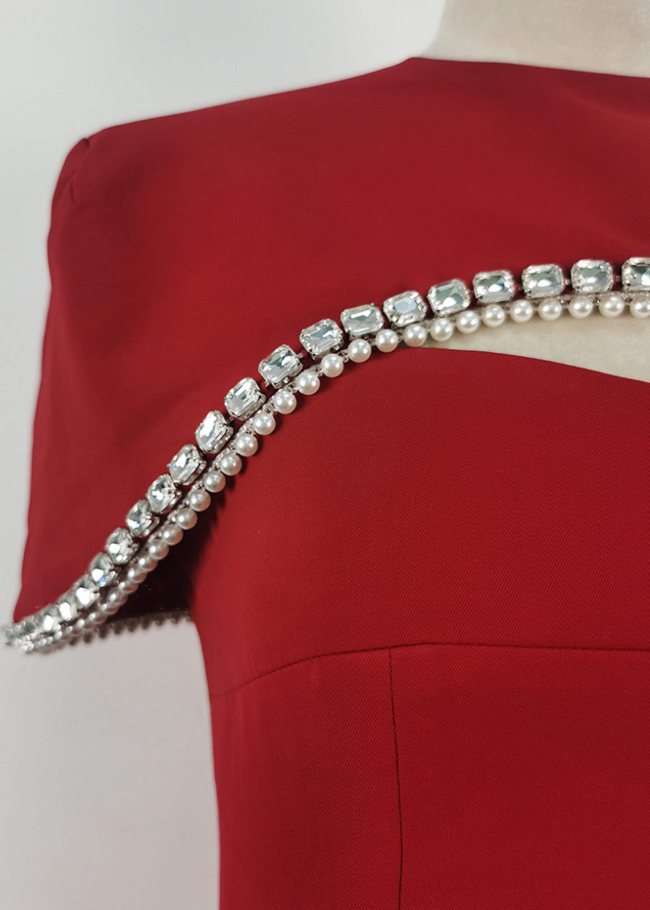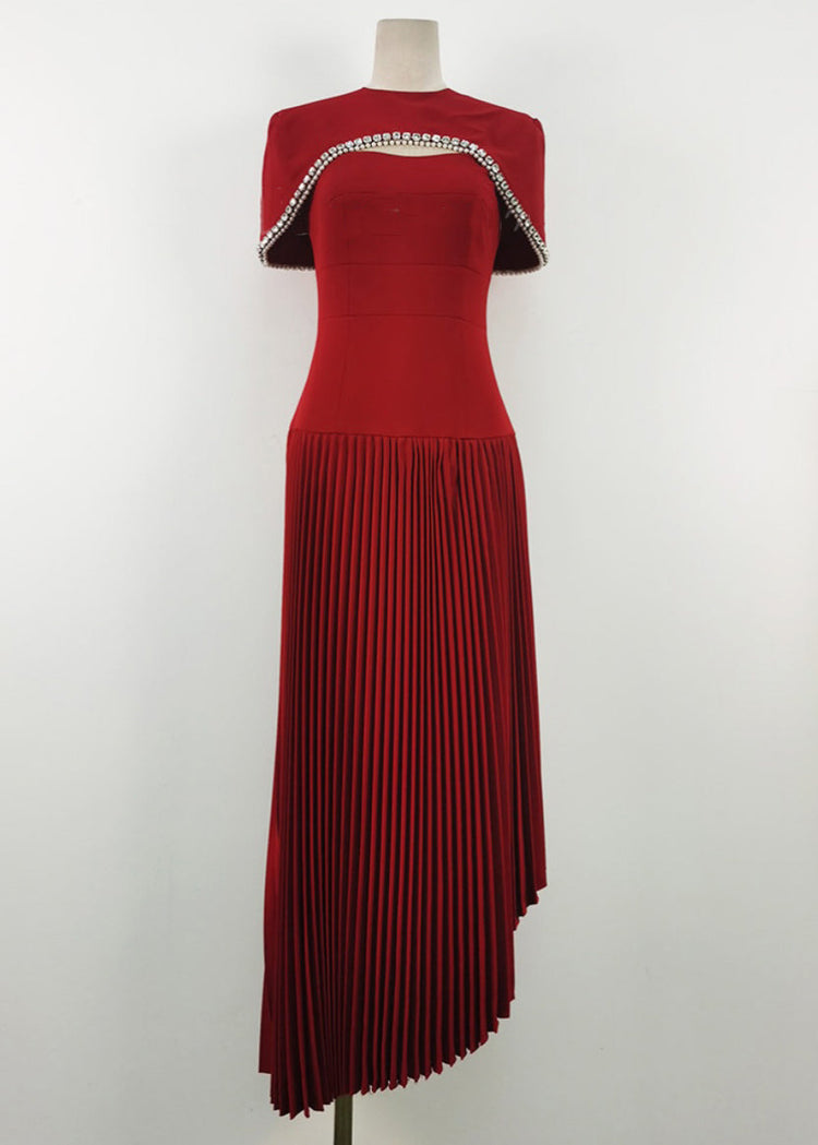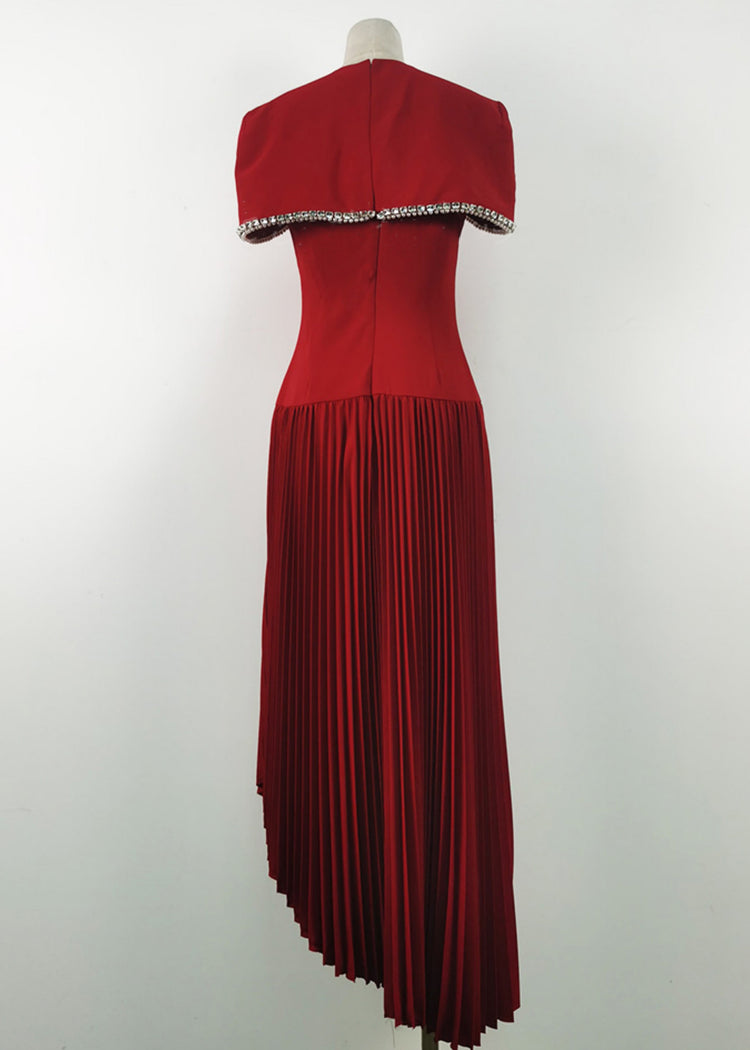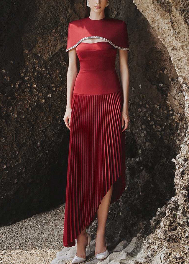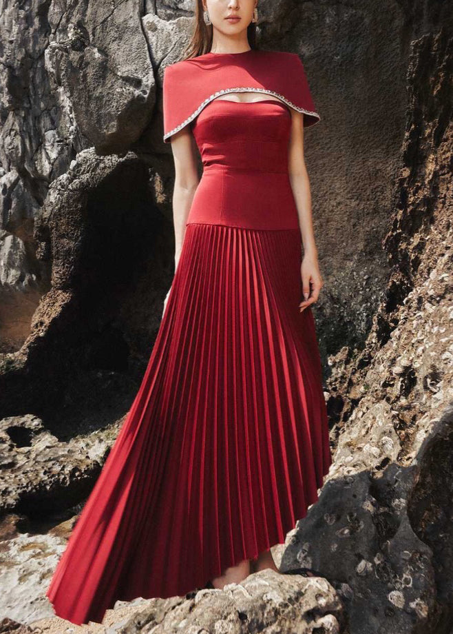 French Red Zircon Pearl Wrinkled Silk Maxi Dresses Summer