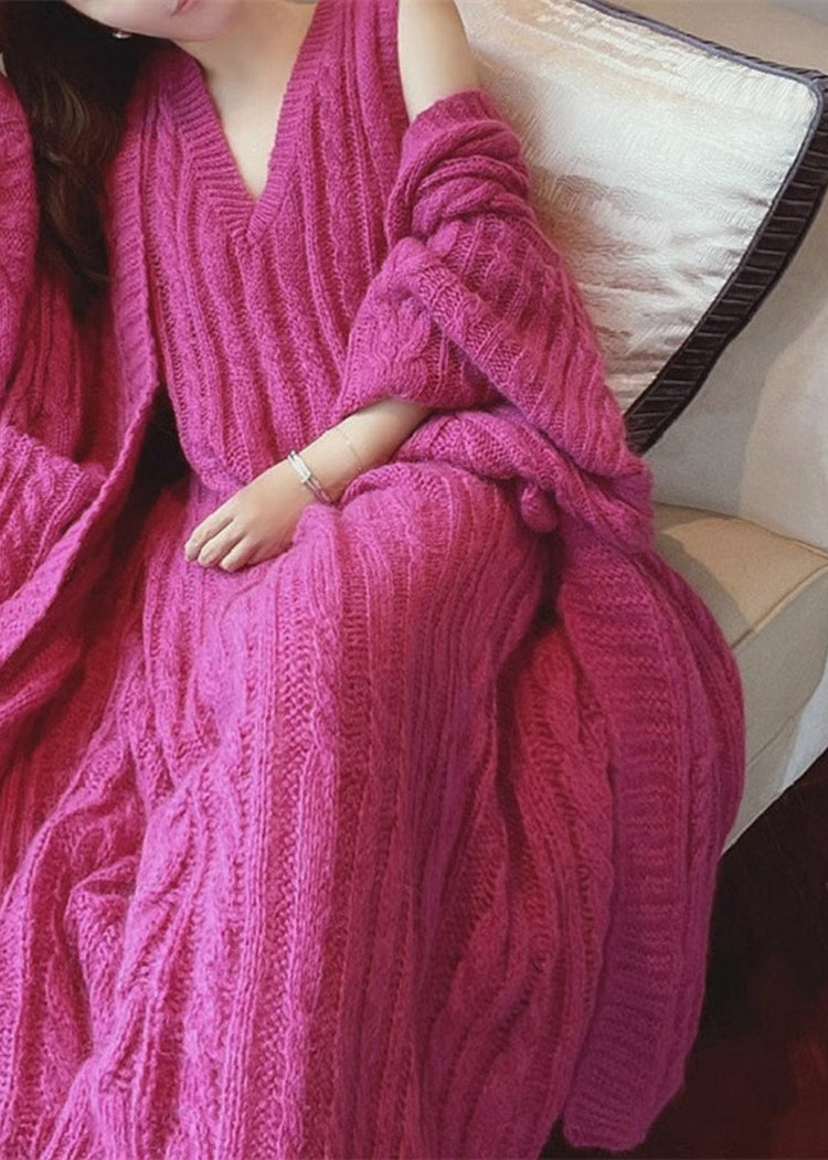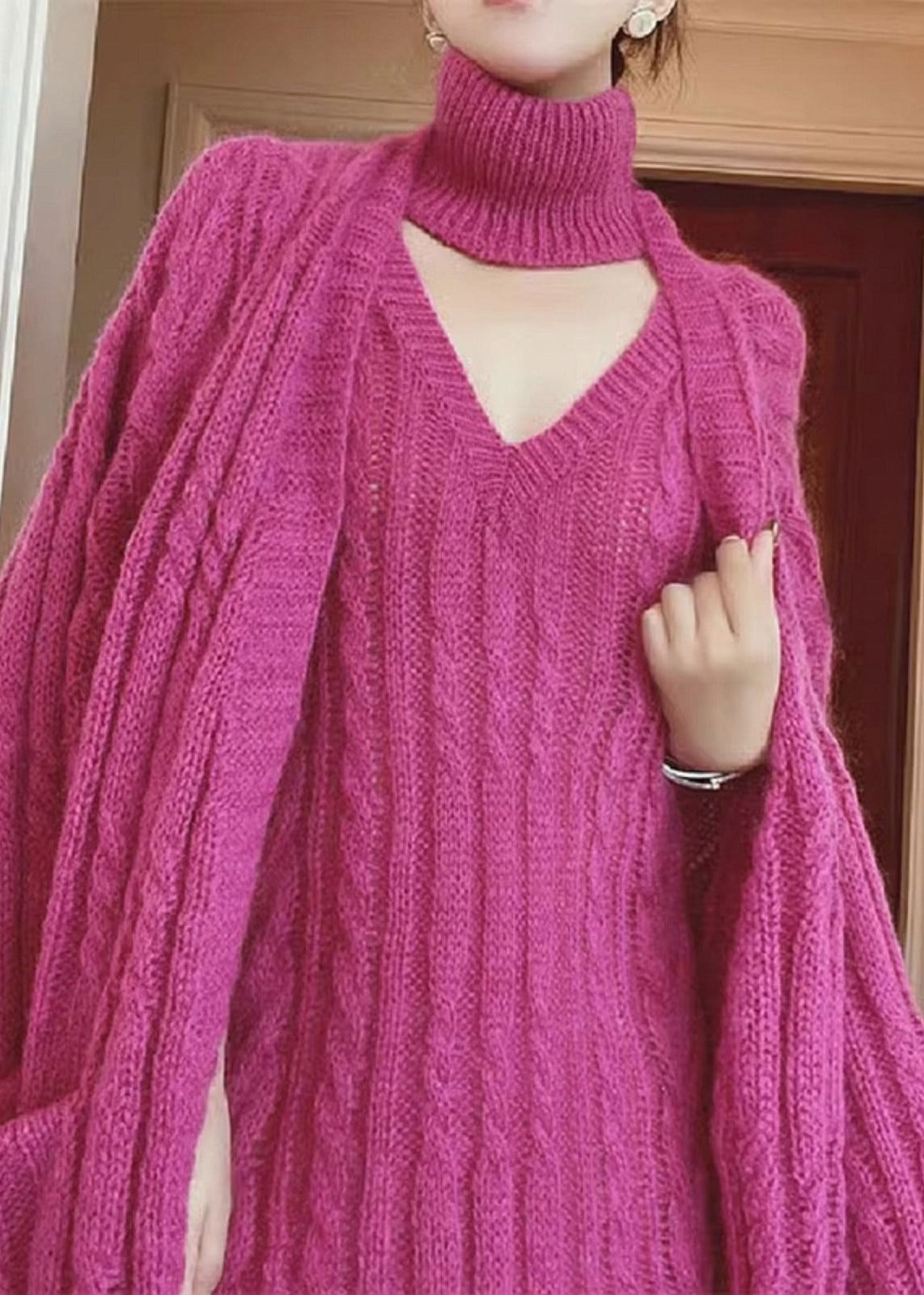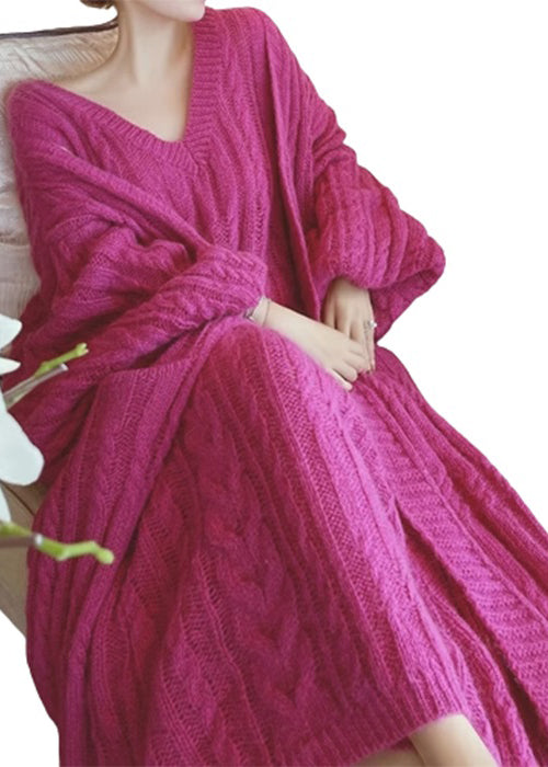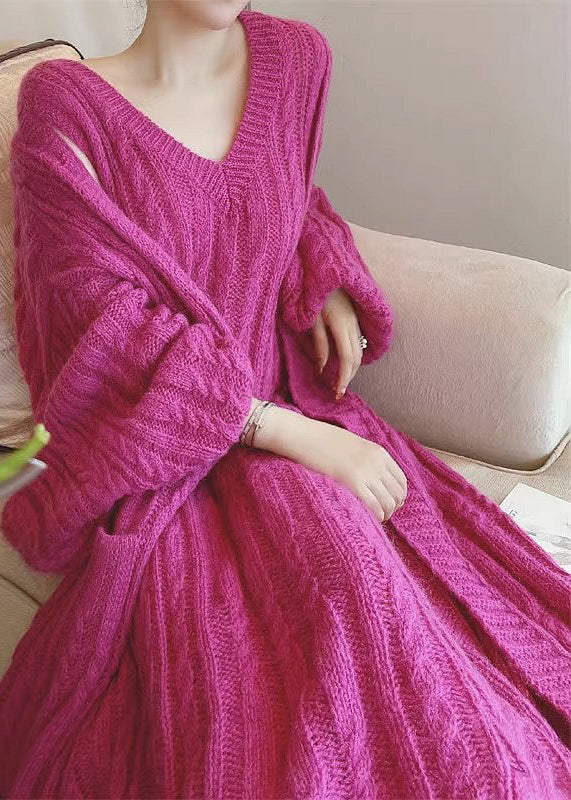 French Rose V Neck Pockets Patchwork Cotton Knit Sets 2 Pieces Fall