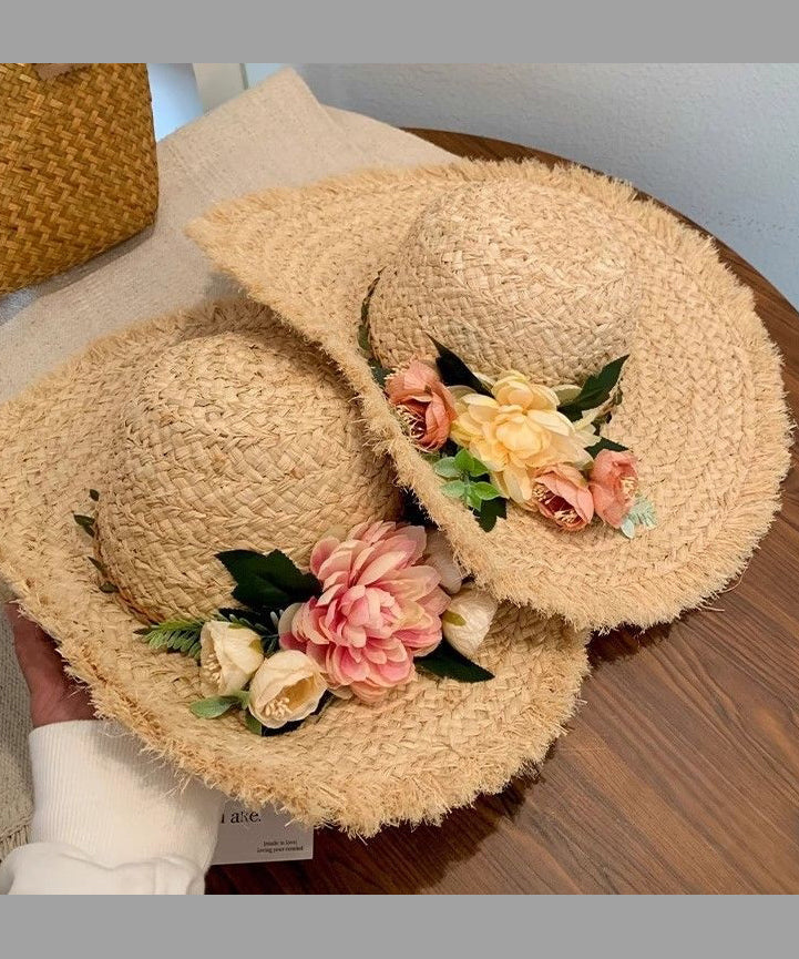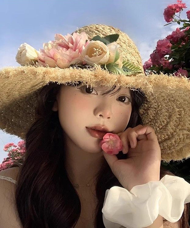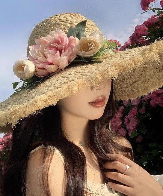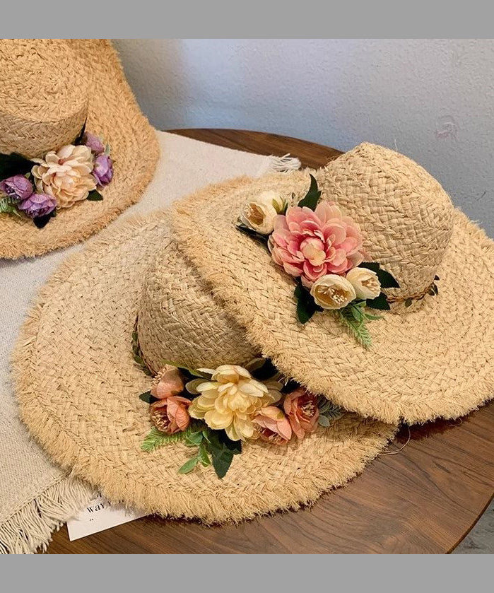 French Style Beige Flower Straw Woven Big Brim Holiday Sun Hat