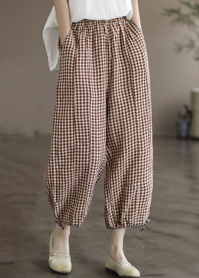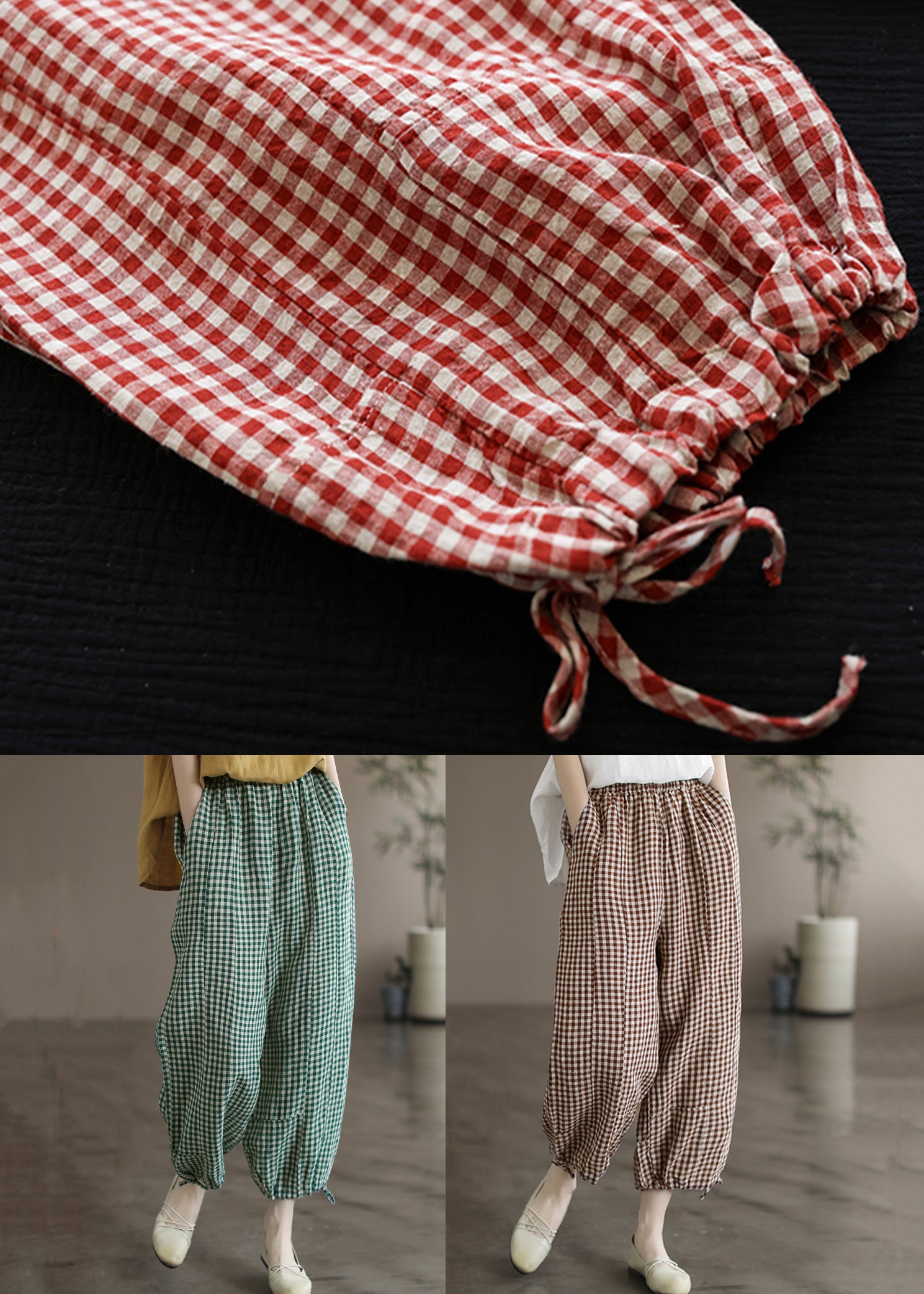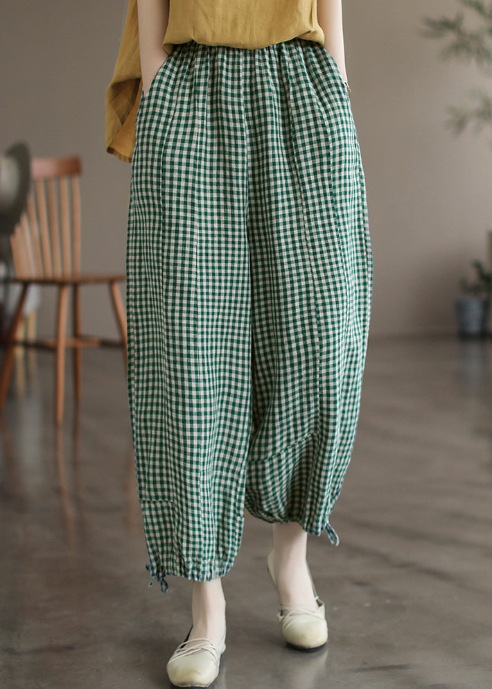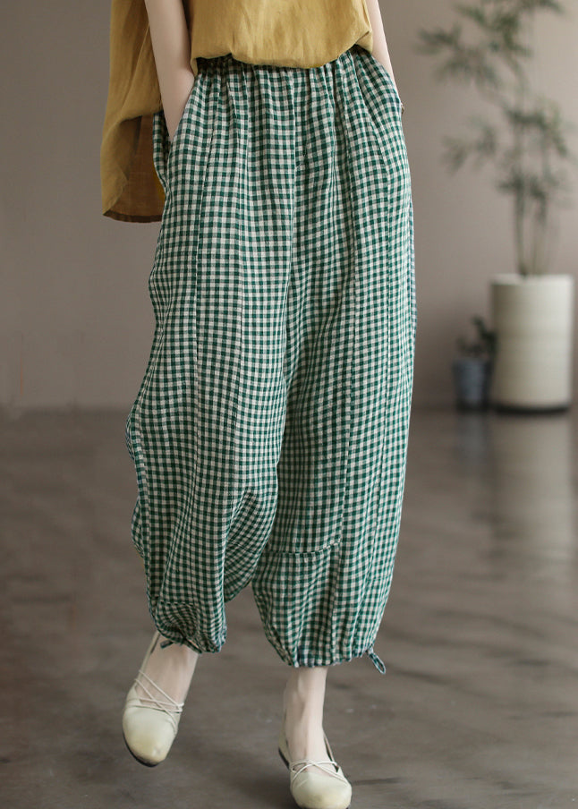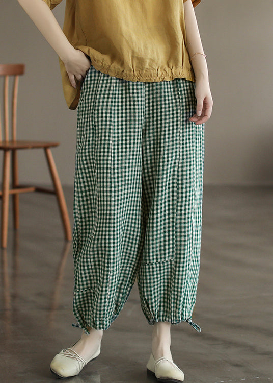 Green Plaid Lace Up Linen Crop Pants High Waist Summer