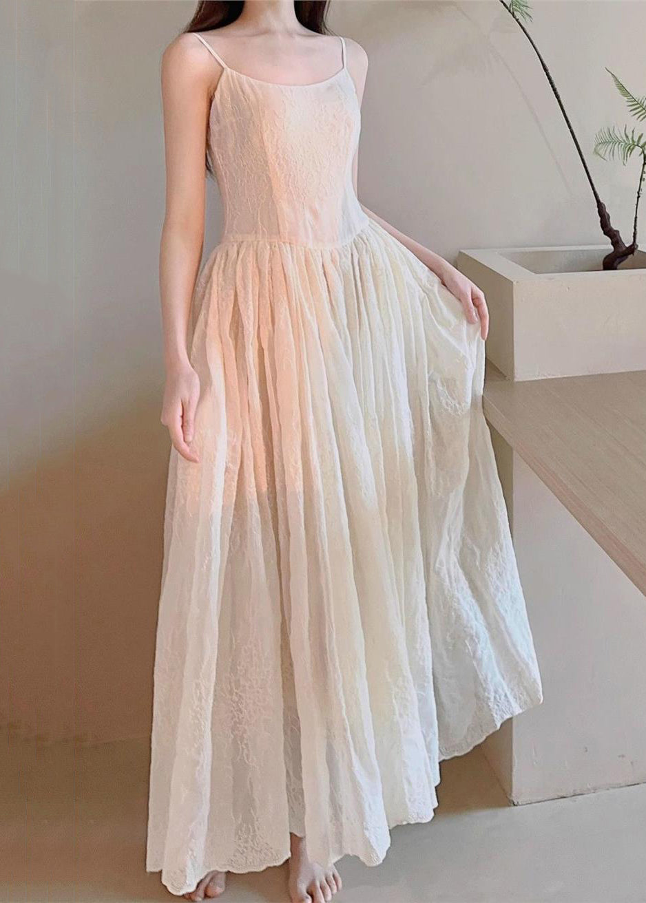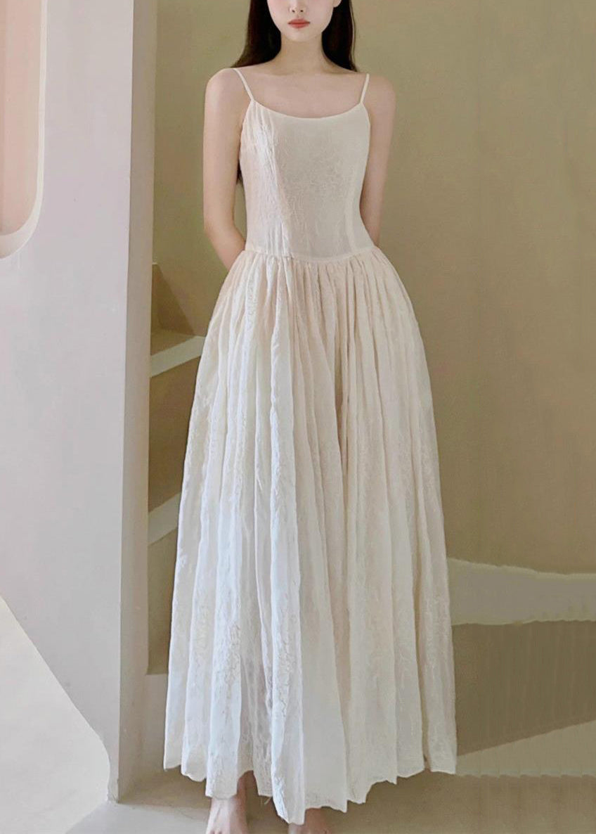 Art Beige Embroidered High Waist Cotton Spaghetti Strap Dress Sleeveless