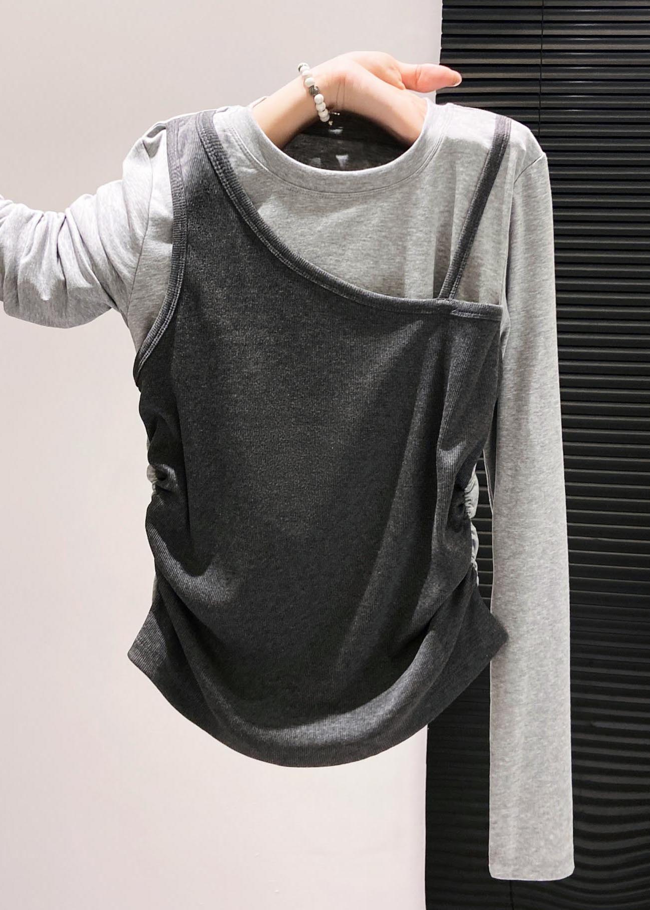 Art Red Asymmetrical Patchwork Cotton Fake Two Piece Blouses Fall