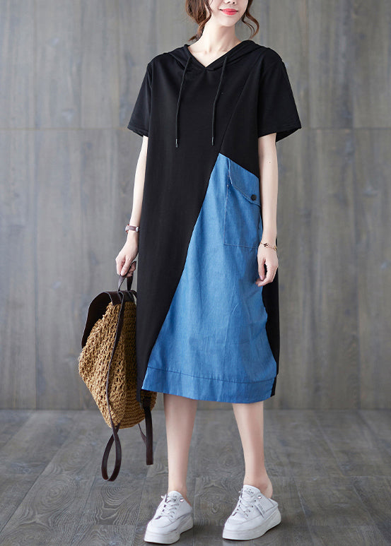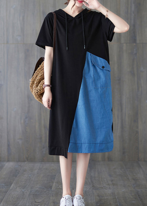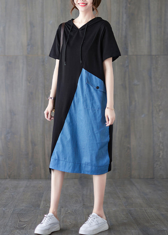 Chic Blue Black Hooded drawstring Patchwork Streetwear Dress Short Sleeve