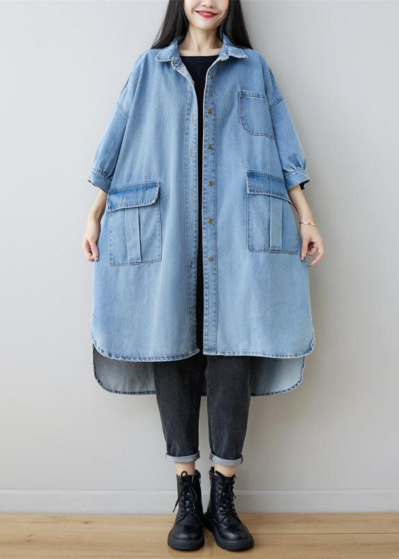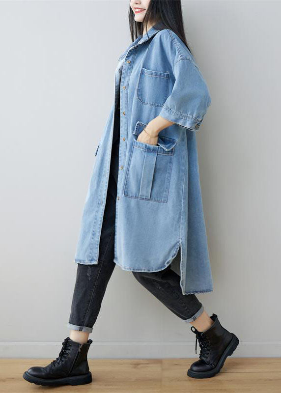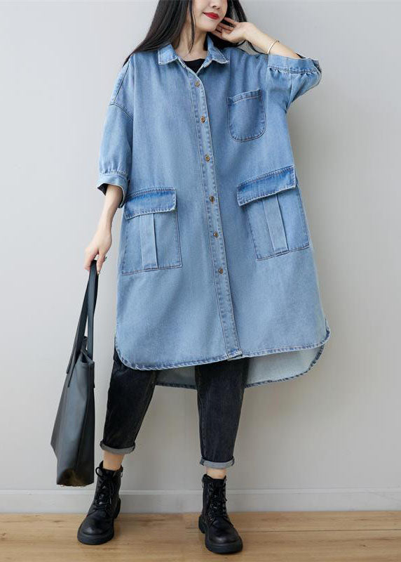 Classy Denim Blue Oversized Pockets Cotton Long Shirts Bracelet Sleeve
