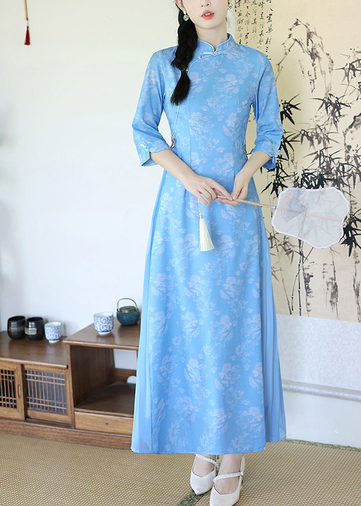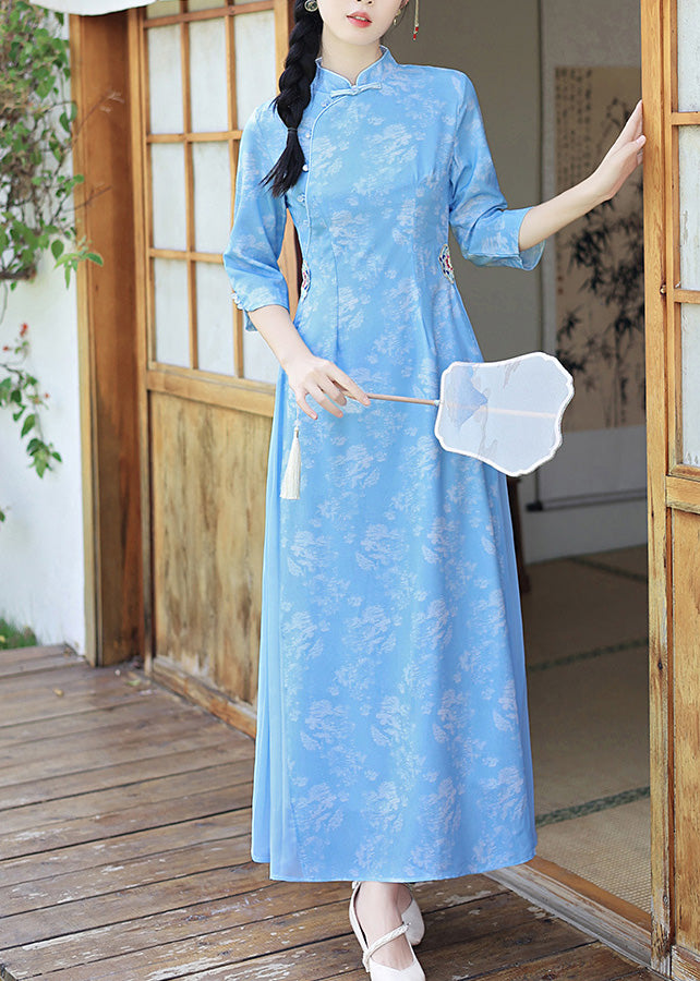 Elegant Baby Blue Stand Collar Button Long Dresses Long Sleeve