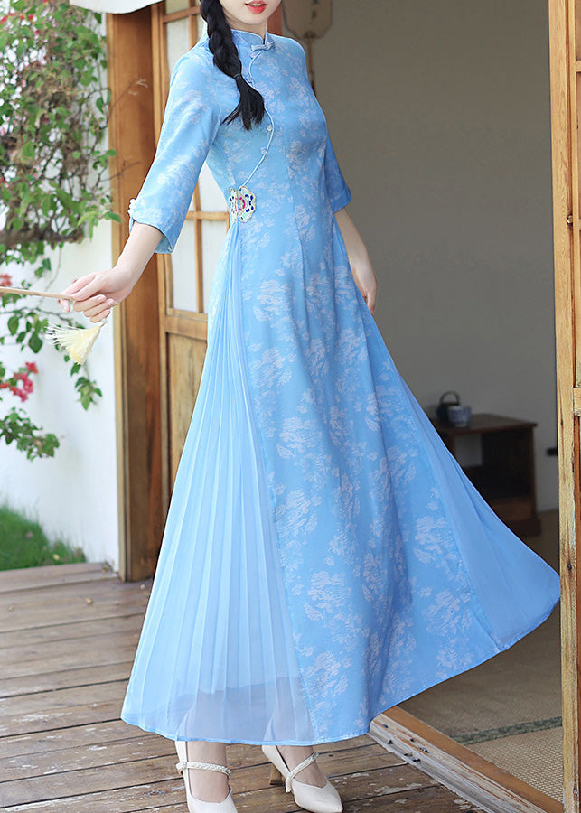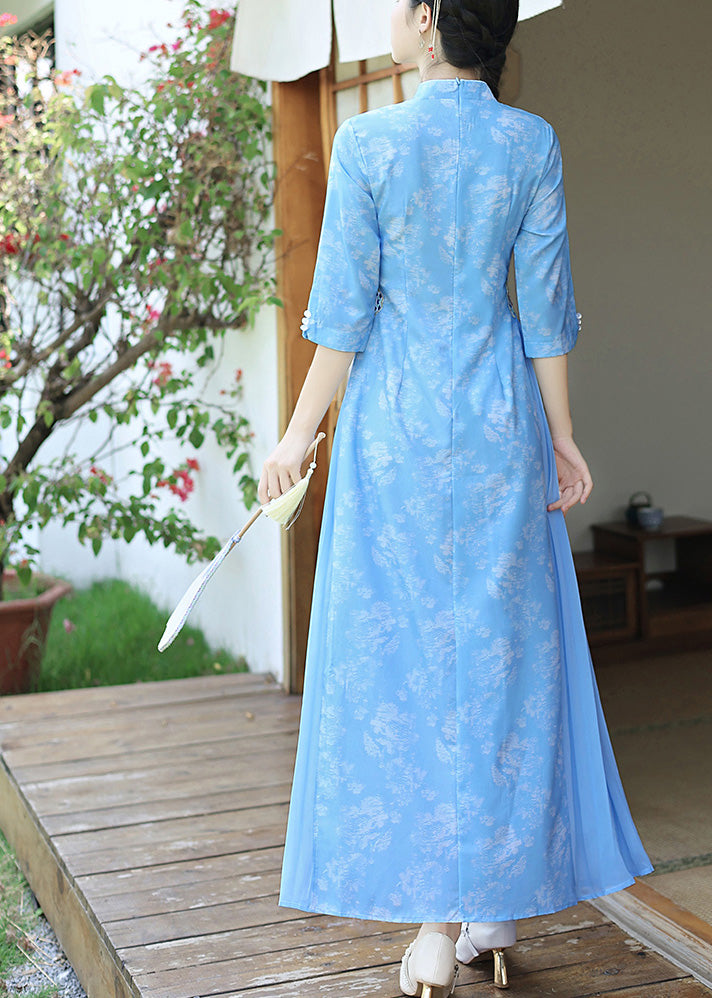 Elegant Blue Stand Collar Print Linen Dress Bracelet Sleeve