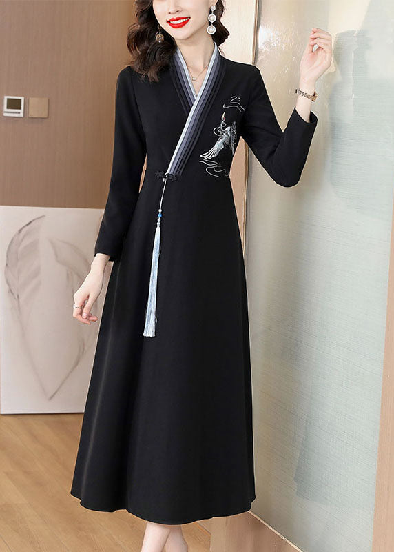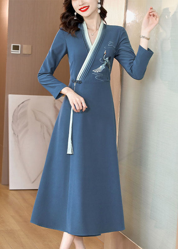 Elegant Blue Embroidered Button Long Dress Long Sleeve