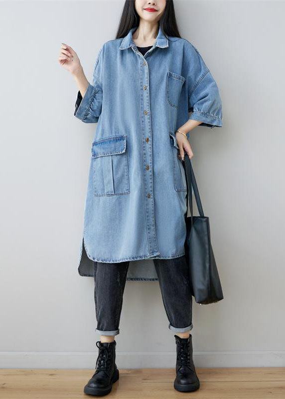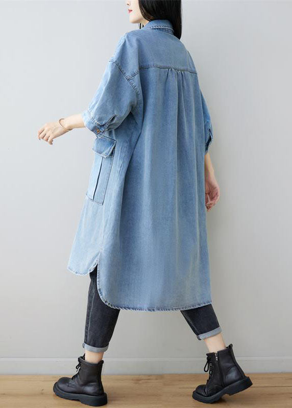 Classy Blue Stand Collar Oversized Pockets Cotton Denim Trench Coat Spring