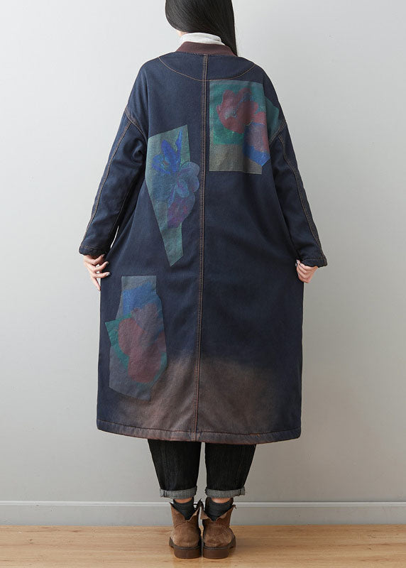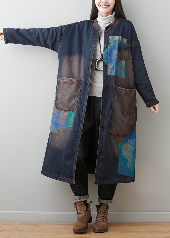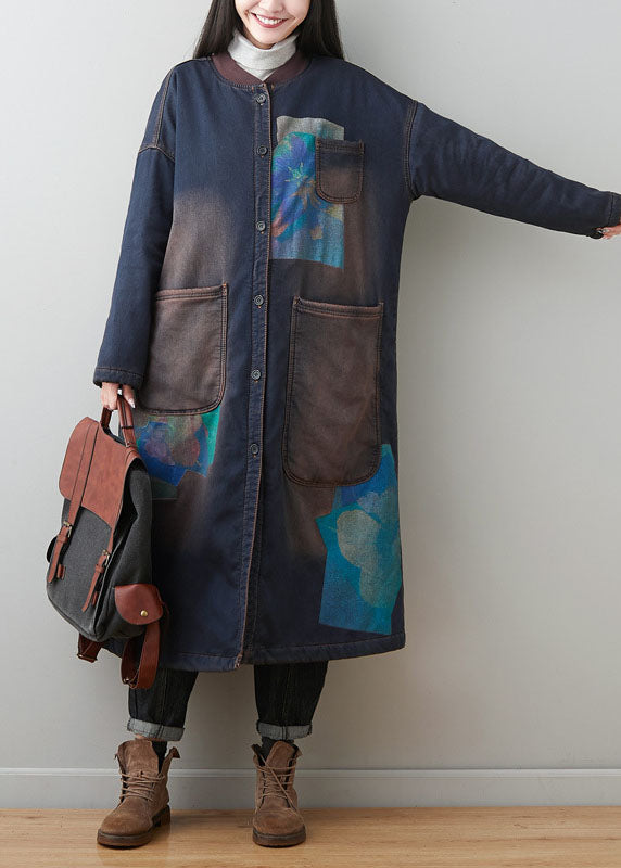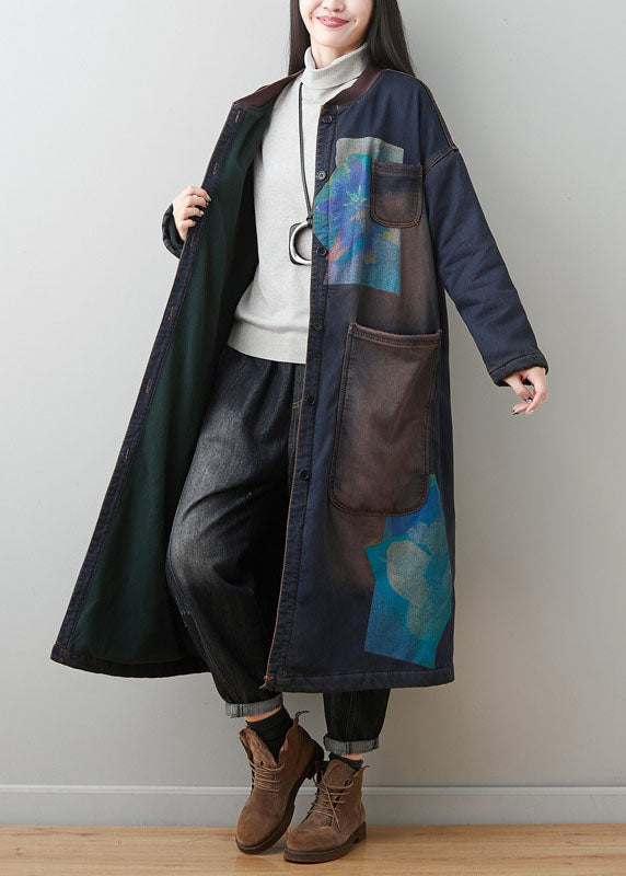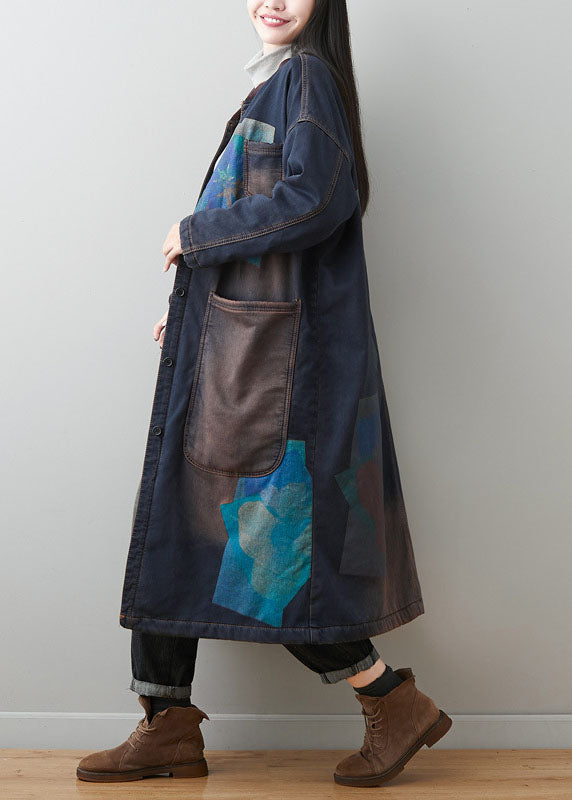 Bohemian Dark Blue Patchwork Pockets Print Warm Fleece Outwear Winter