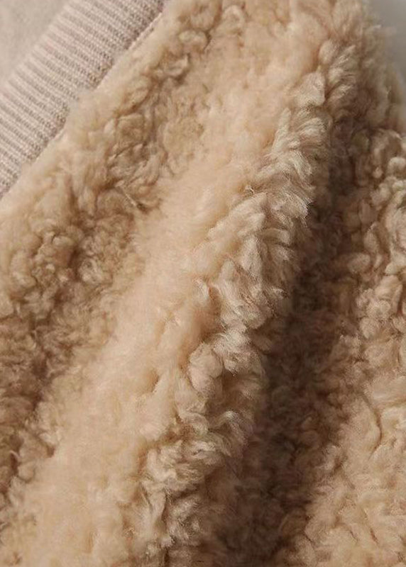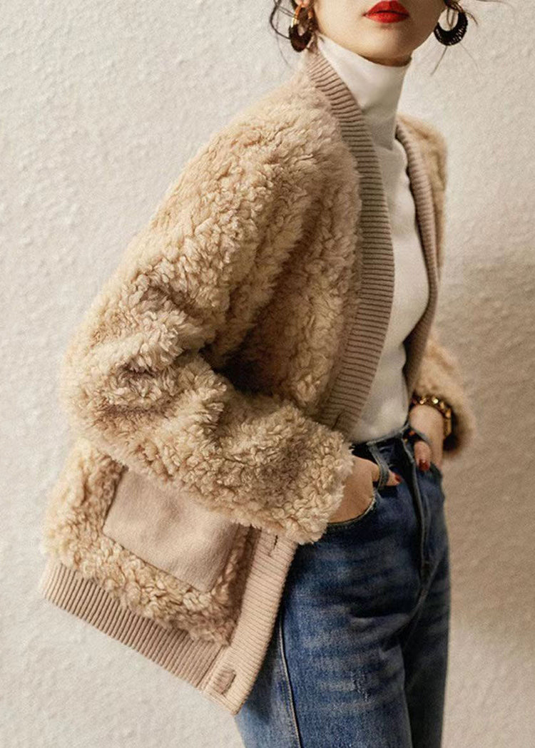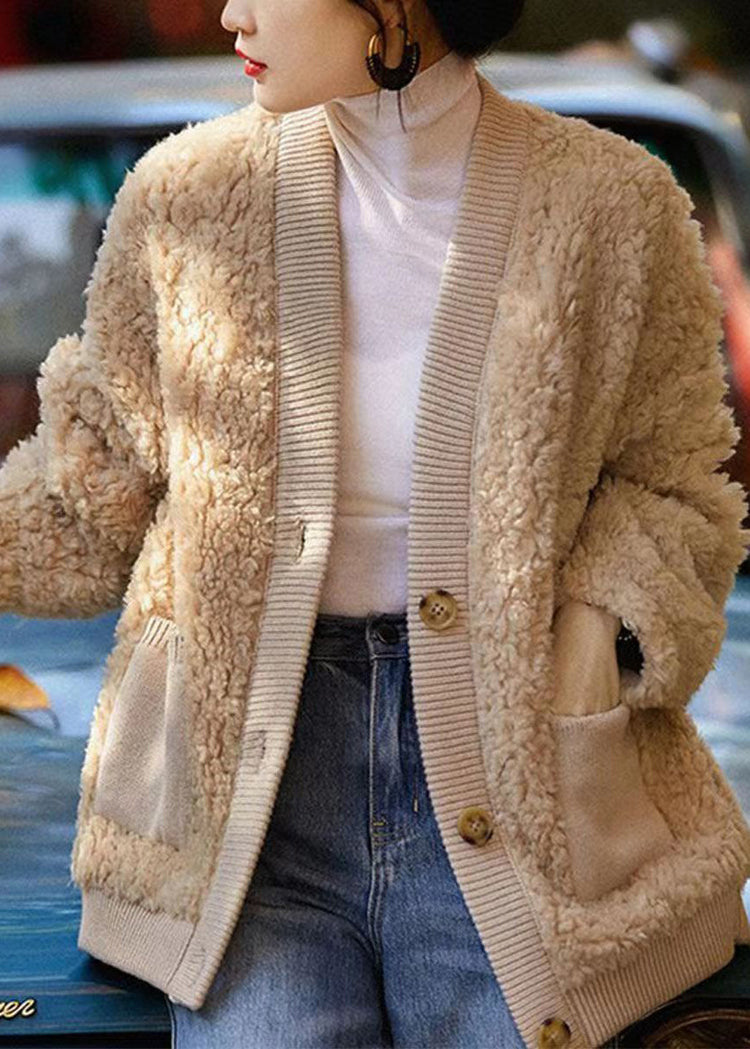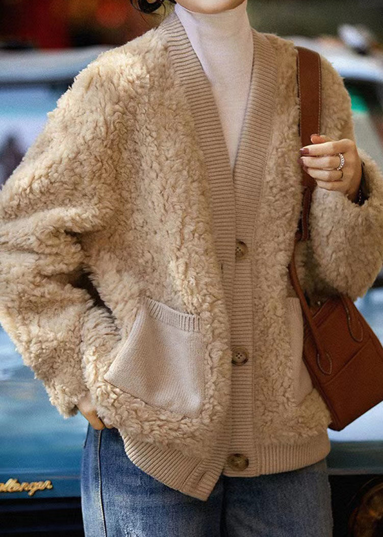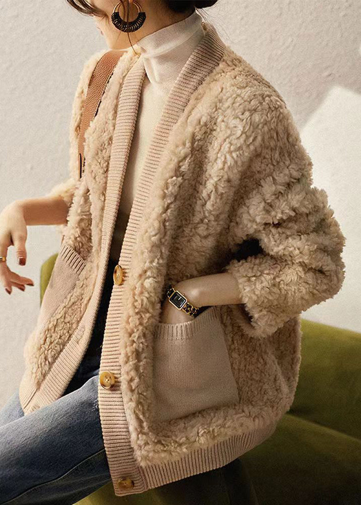 Boutique Camel V Neck Pockets Patchwork Wool Jacket Winter