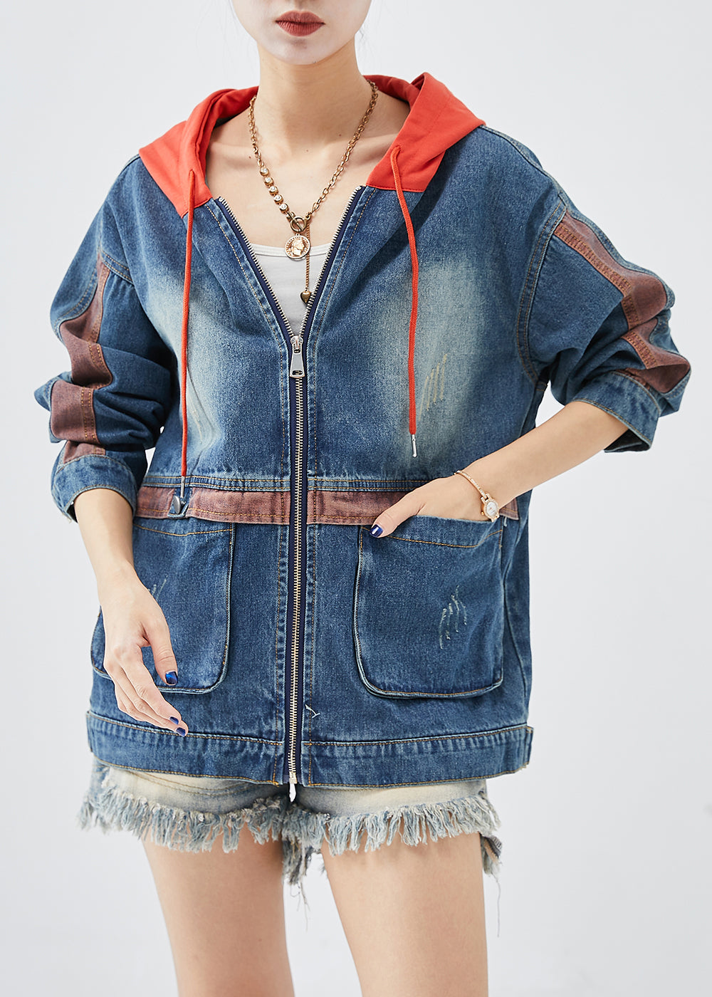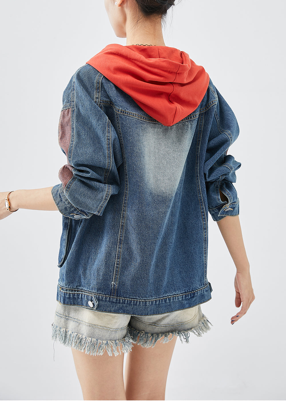 Casual Red Hooded Patchwork Denim Coats Fall