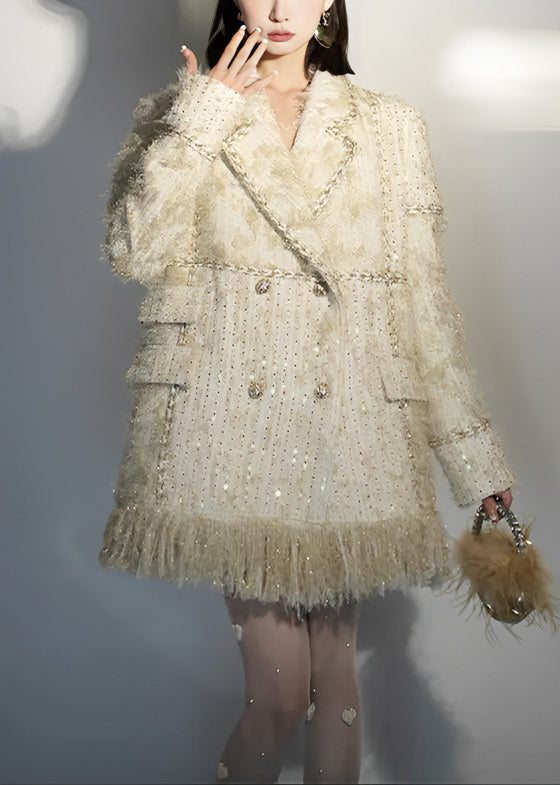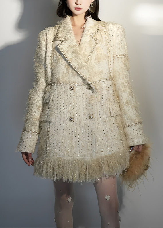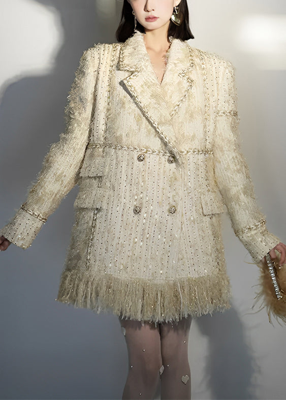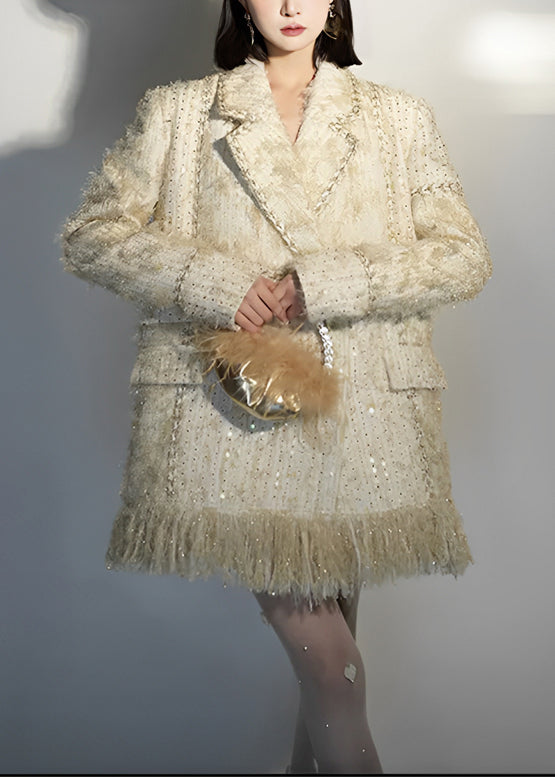 Chic Beige Peter Pan Collar Tasseled Patchwork Cotton Coat Long Sleeve