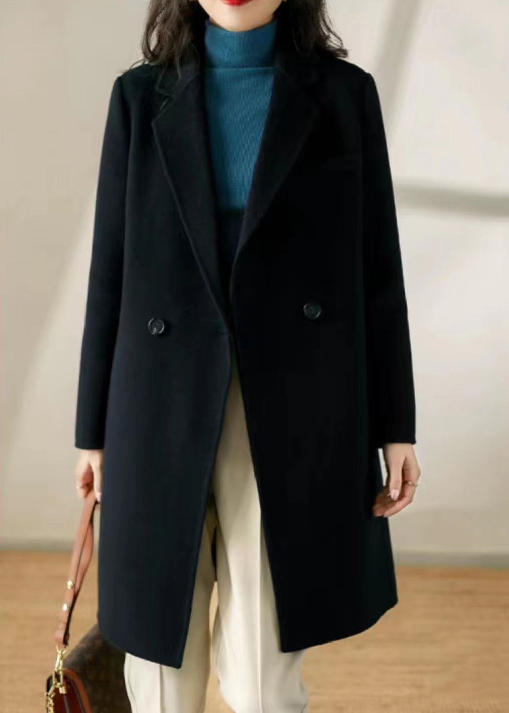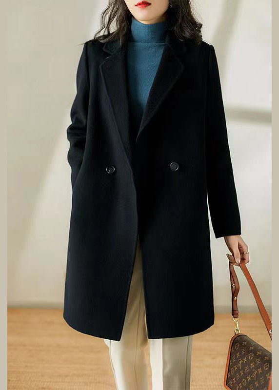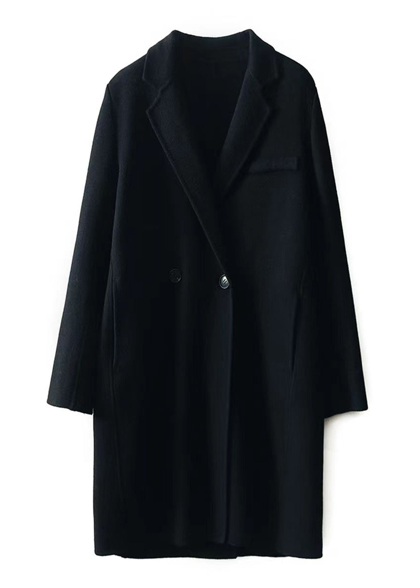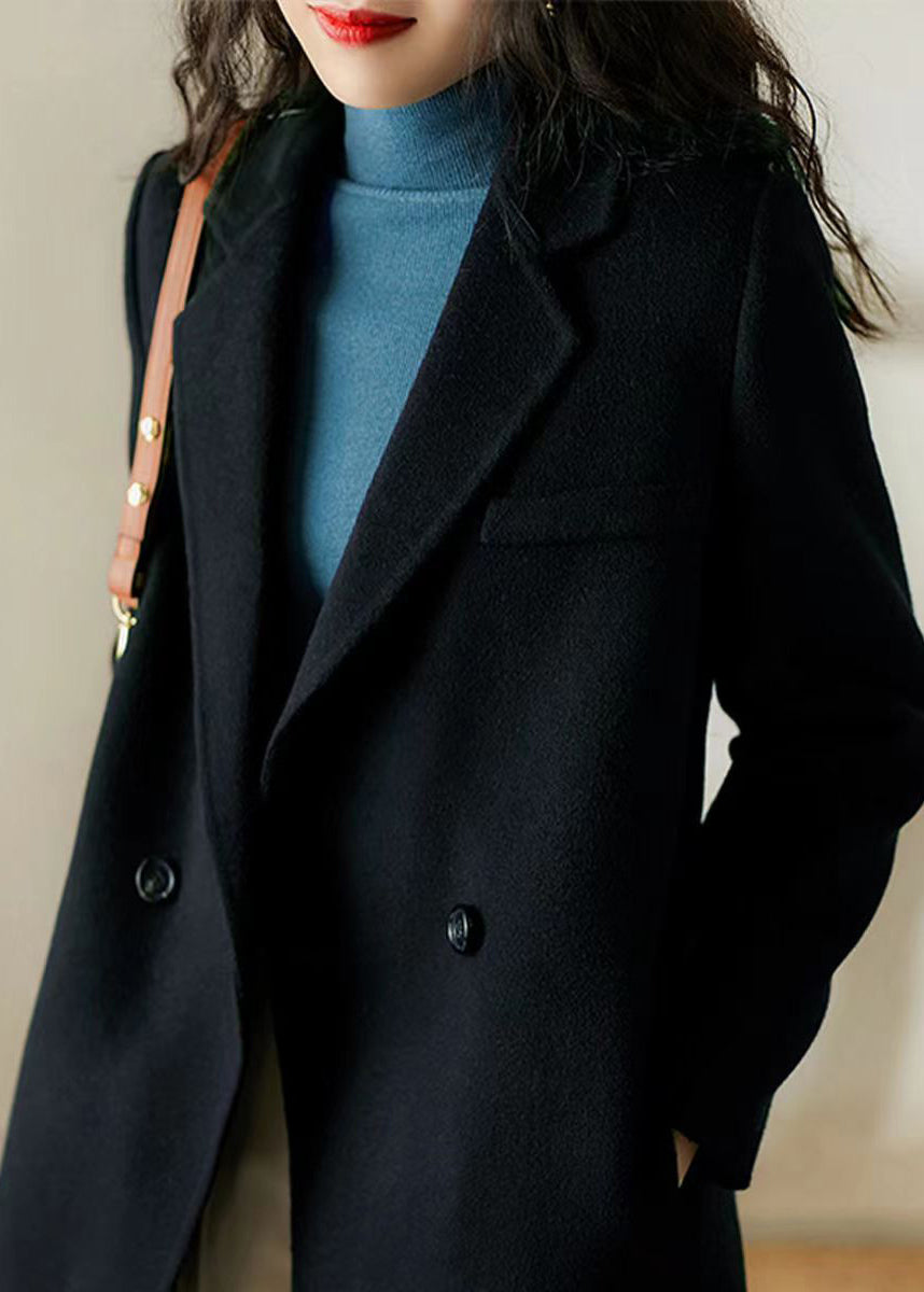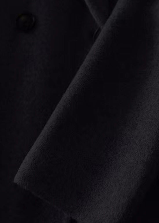 Chic Black Peter Pan Collar Pockets Patchwork Woolen Trench Winter