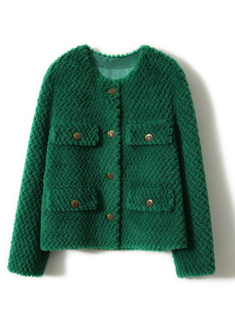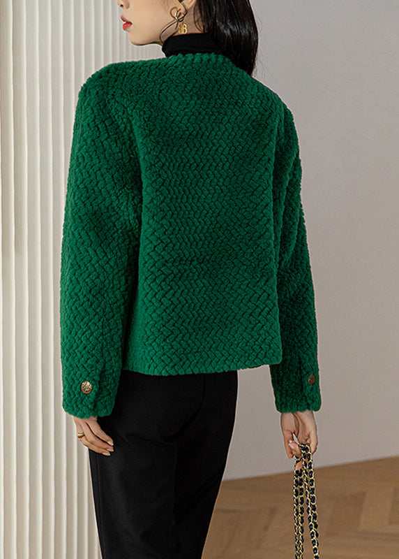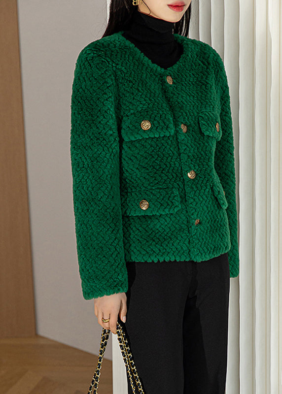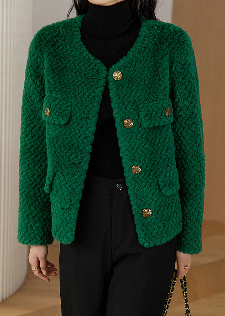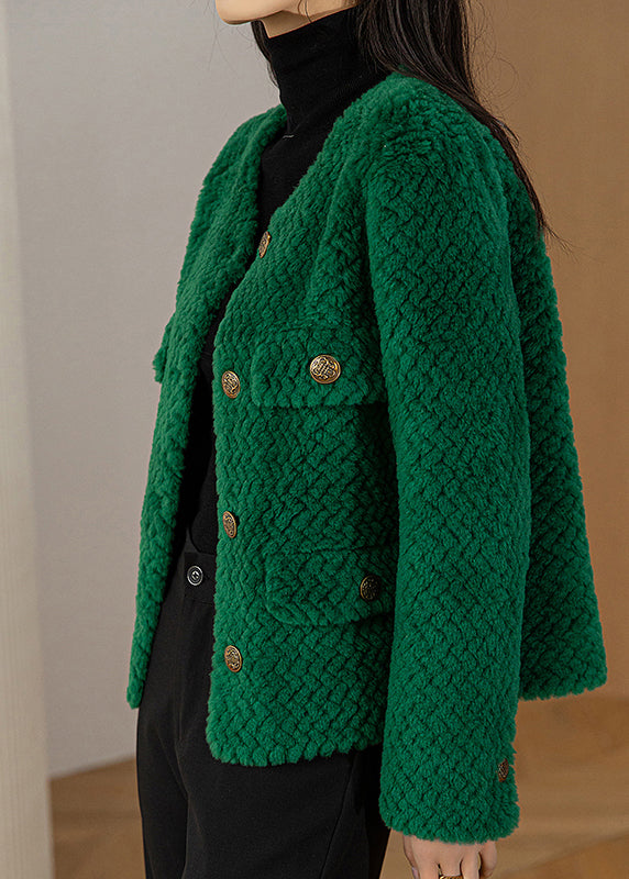 Chic Green O-Neck Button Woolen Coat Long Sleeve