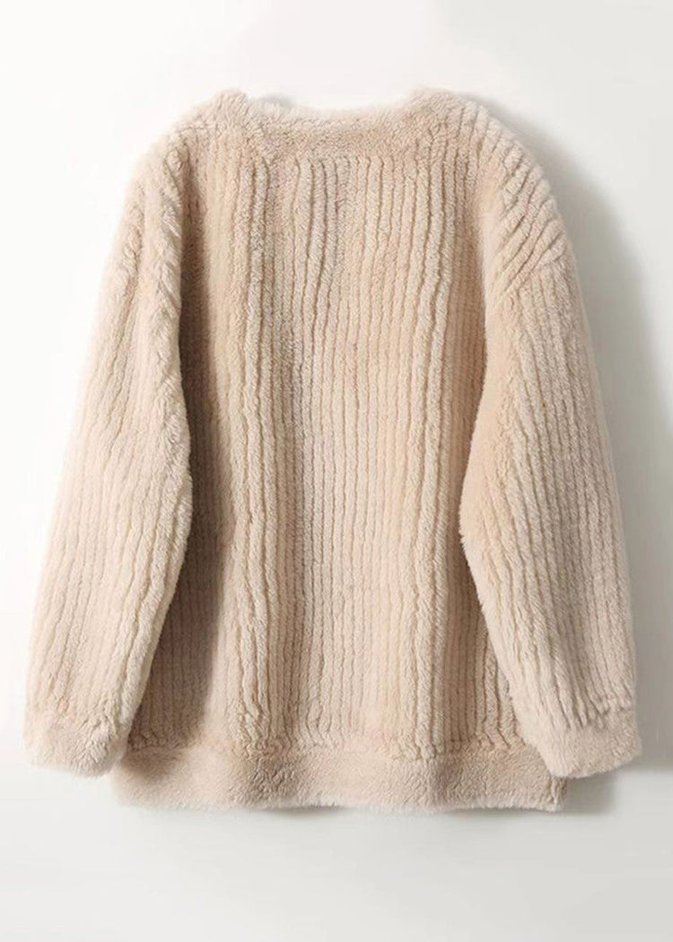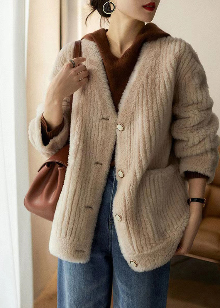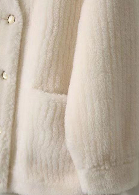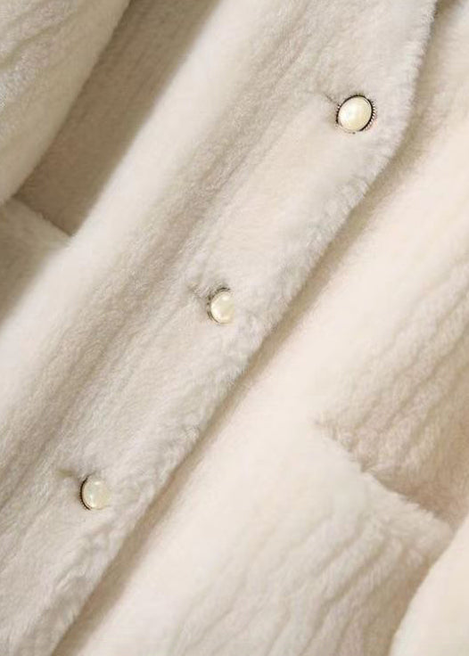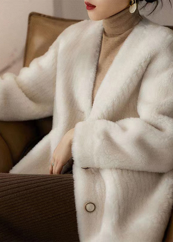 Chic White V Neck Pockets Patchwork Wool Coats Winter