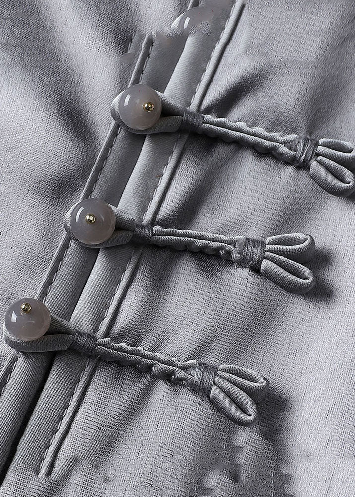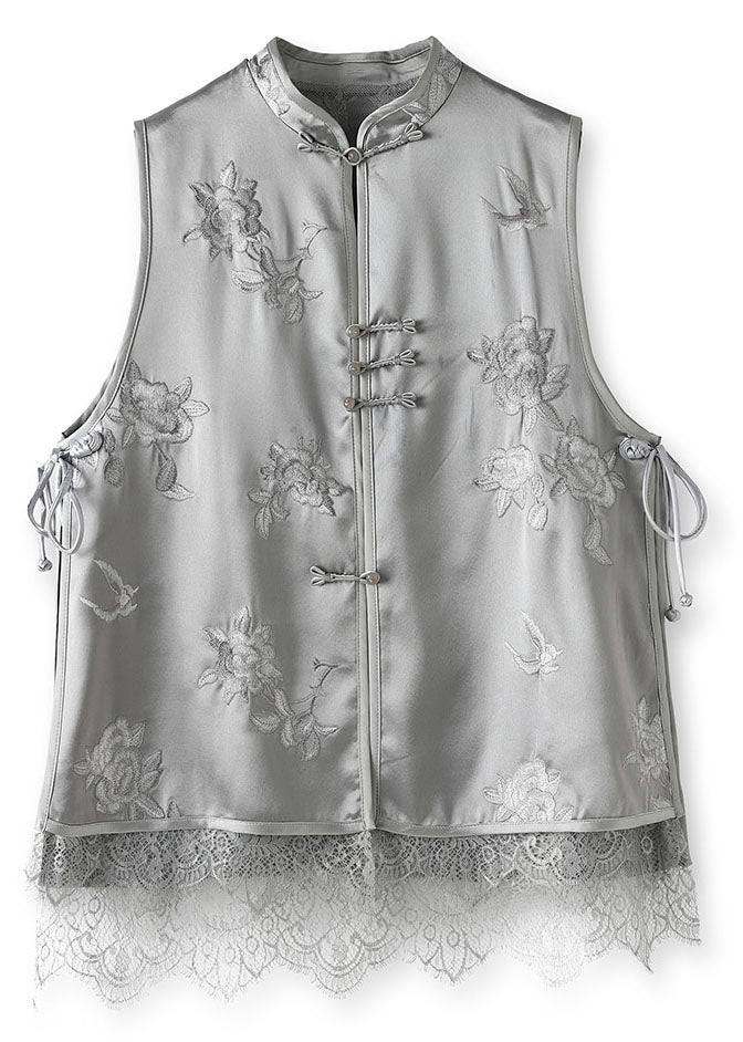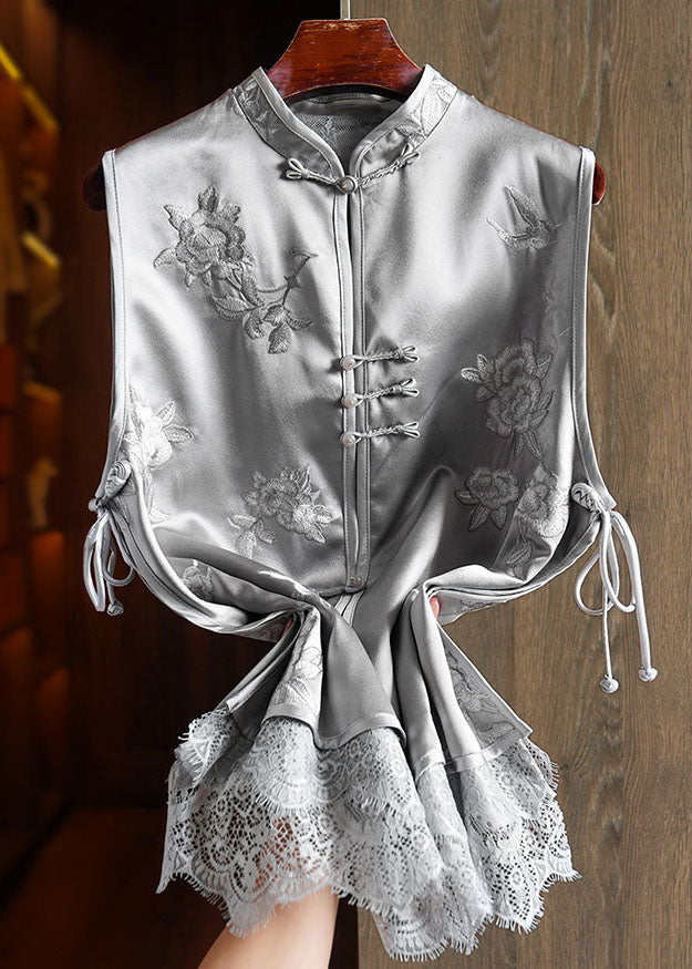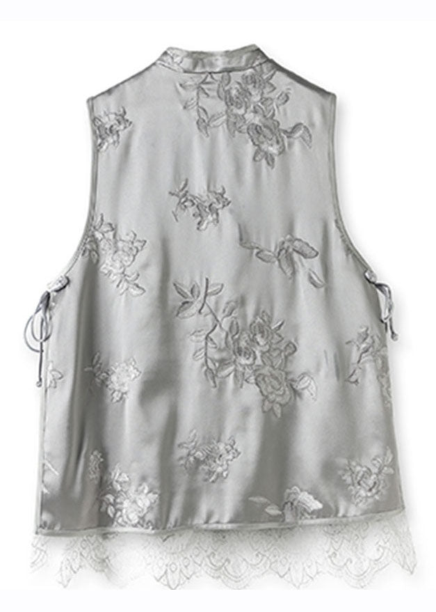 DIY Grey Embroideried Lace Patchwork Button Silk Coats Sleeveless