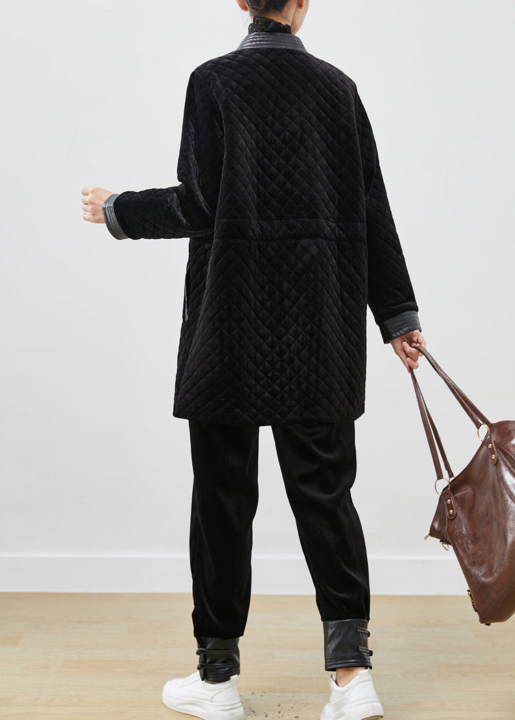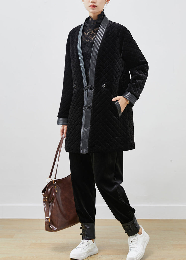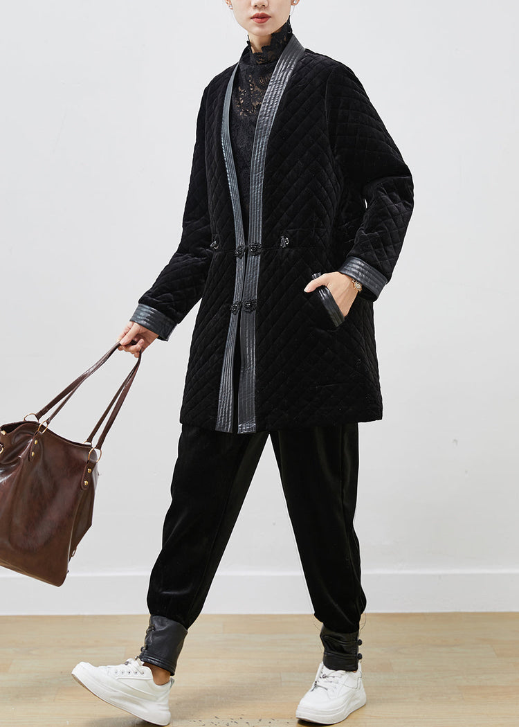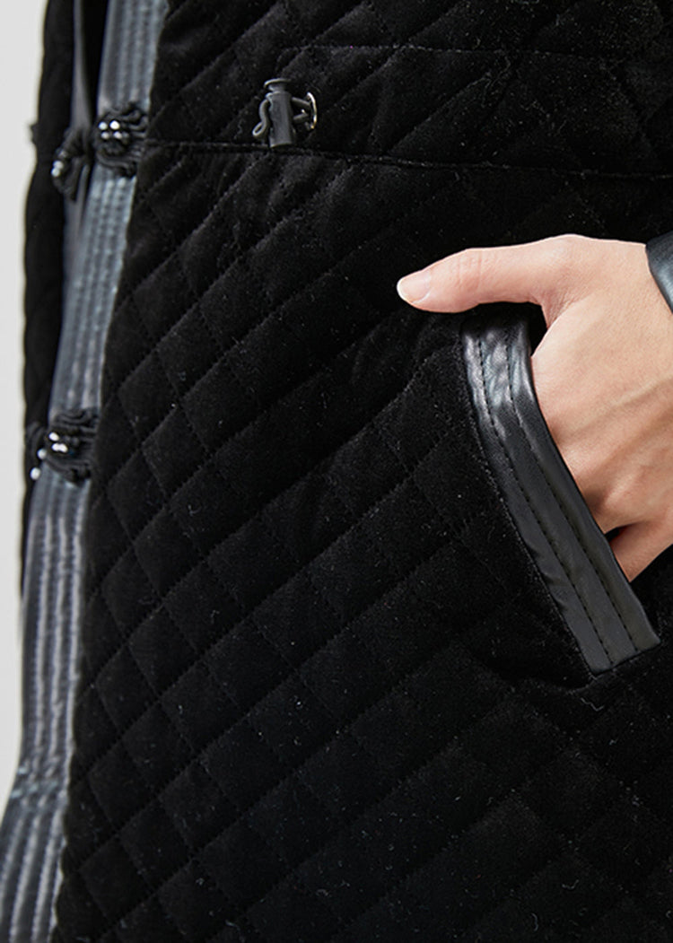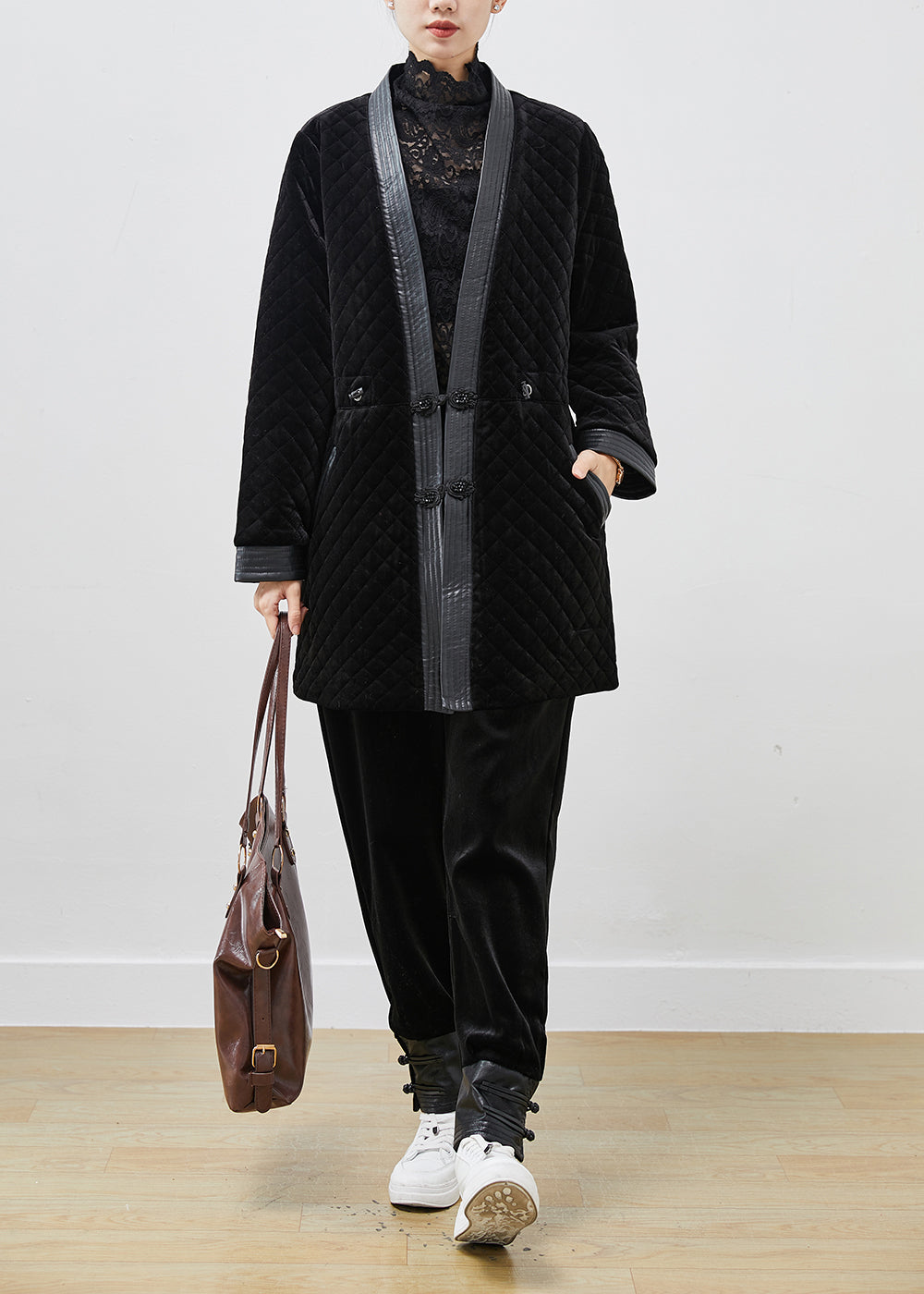 Elegant Black Chinese Button Patchwork Silk Velour Coat Winter