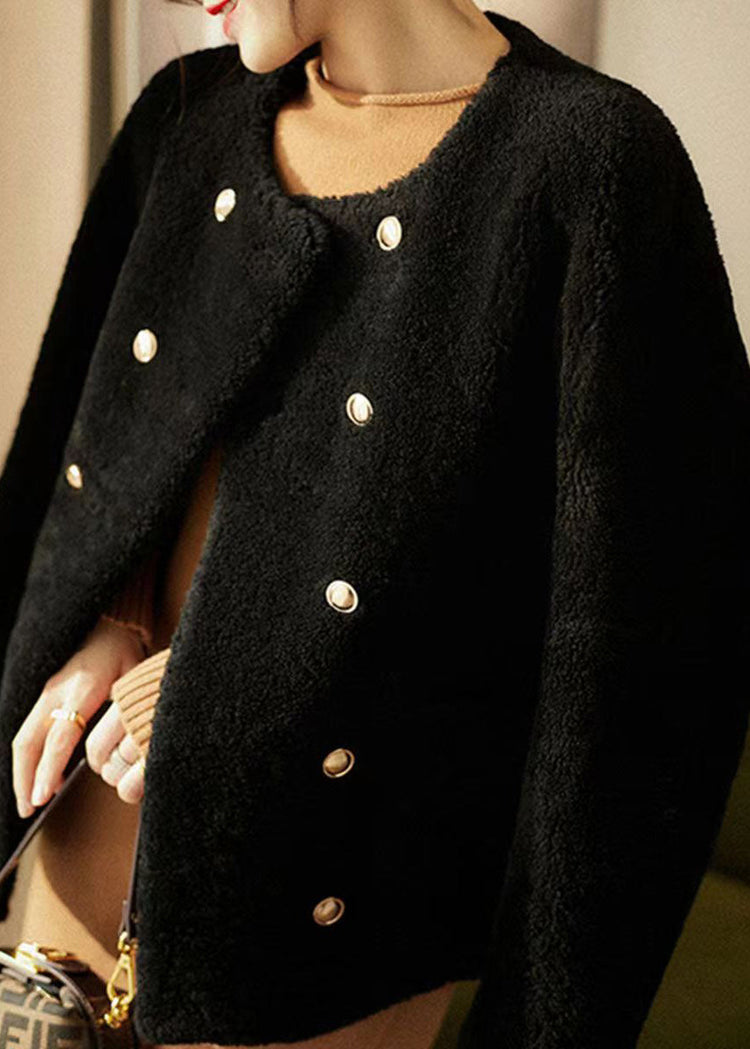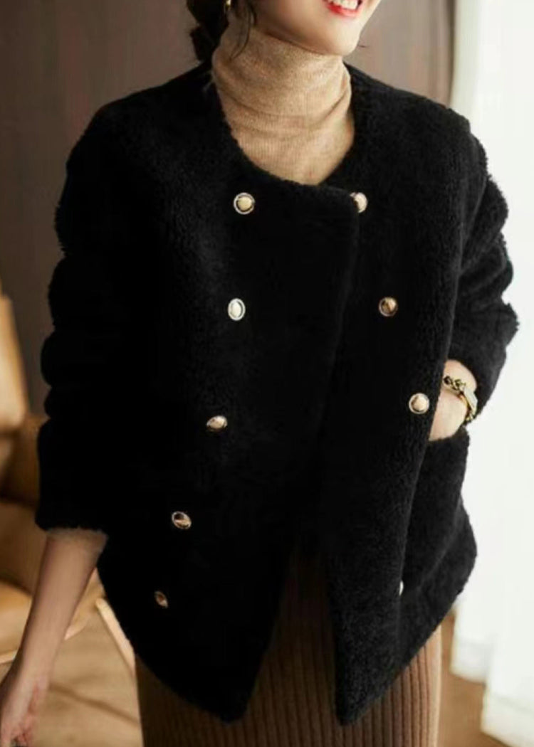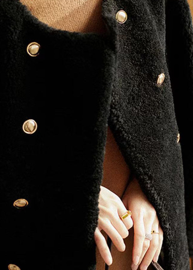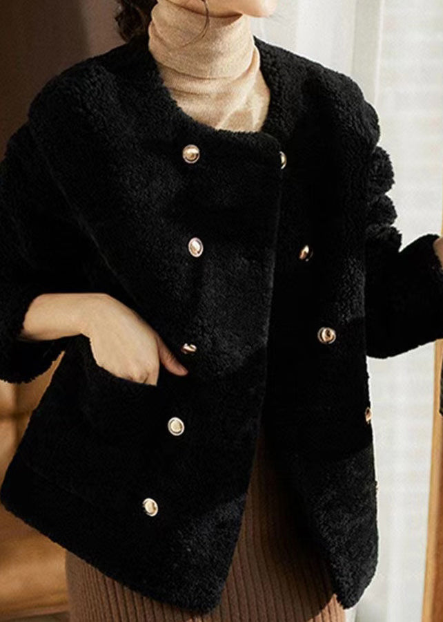Elegant Black O Neck Pockets Patchwork Wool Coats Winter