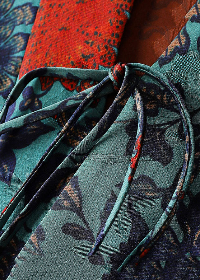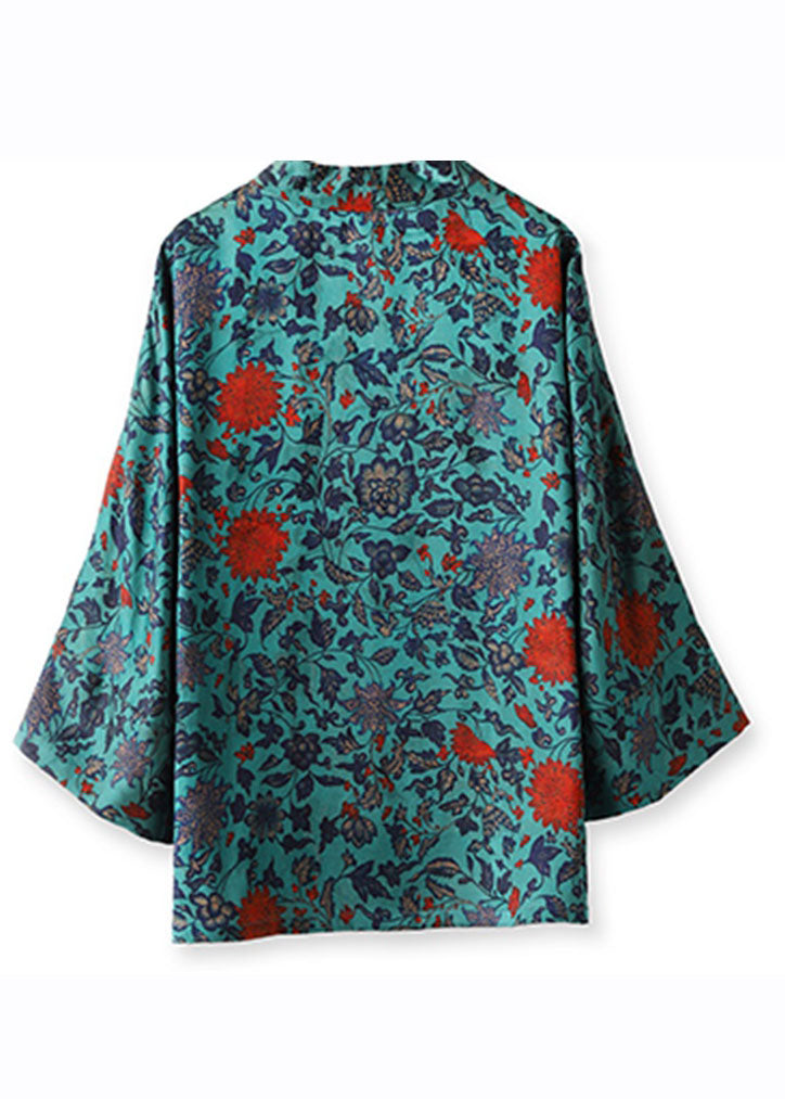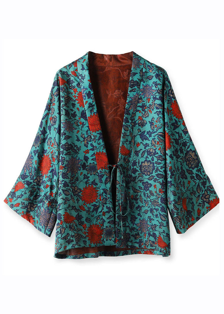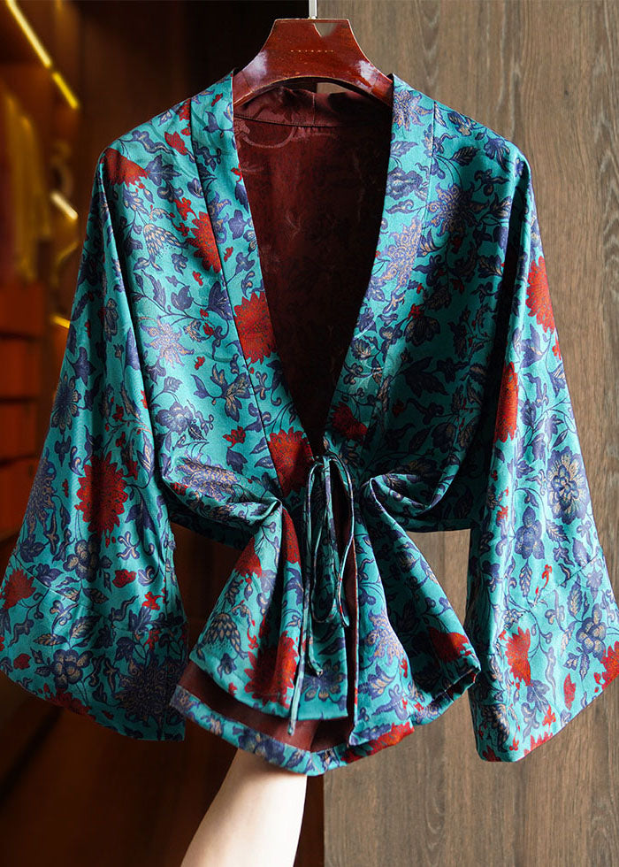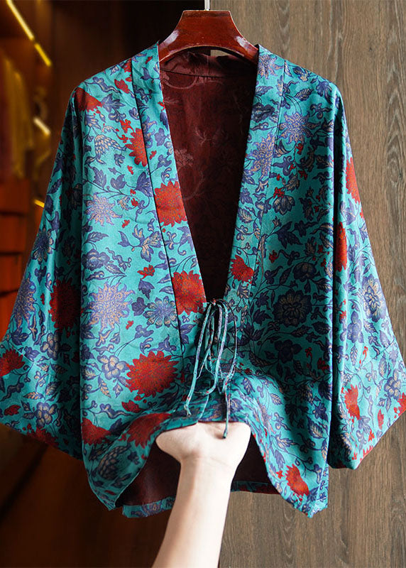 Elegant Blue V Neck Print Tie Waist Silk Coats Long Sleeve