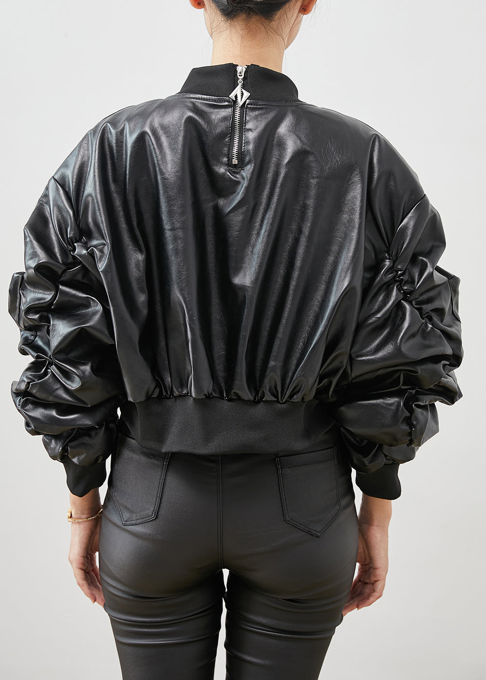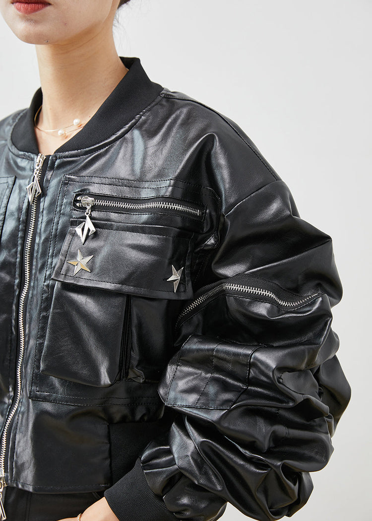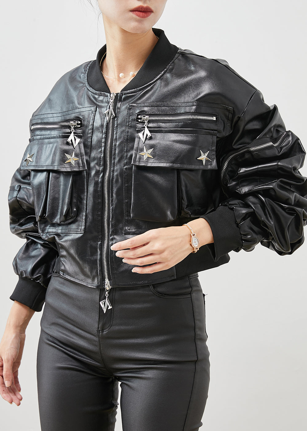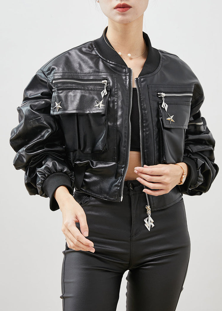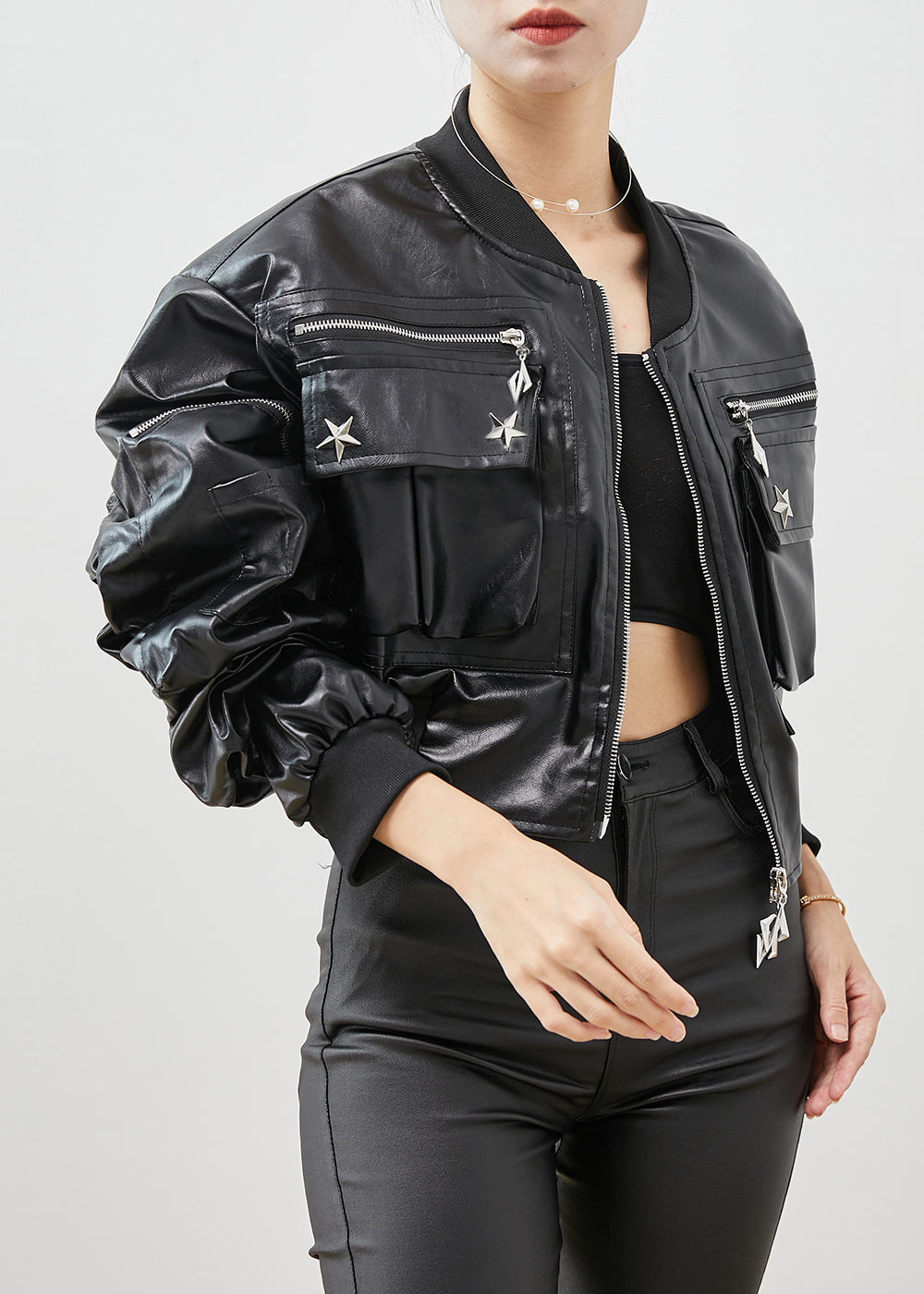 Fashion Black Zip Up Rivet Faux Leather Jackets Spring