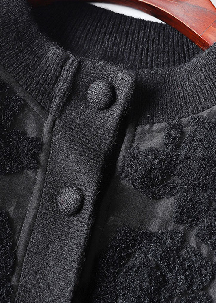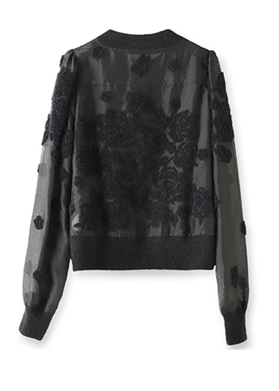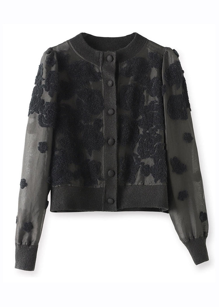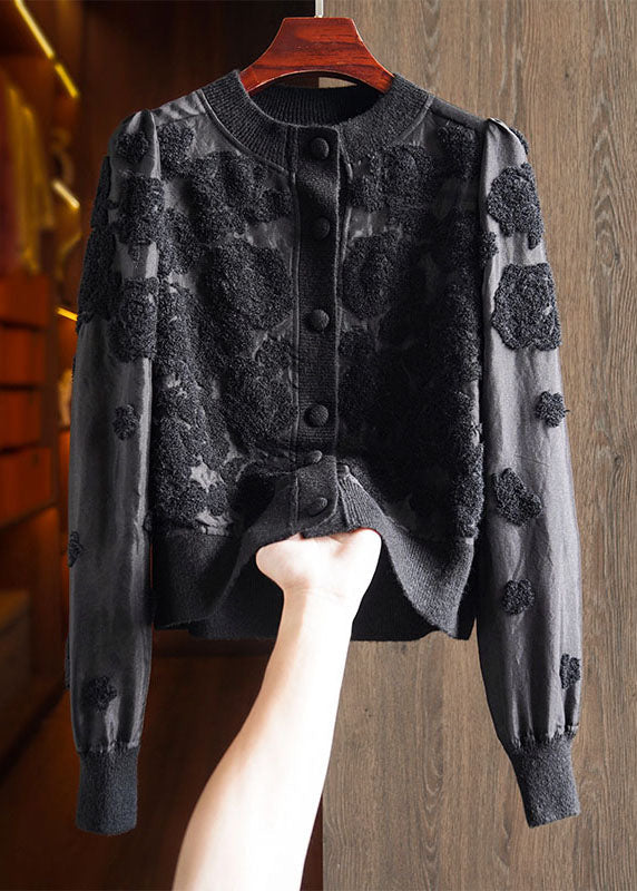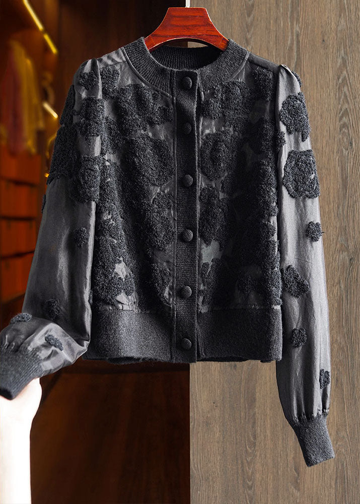 French Black O-Neck Button Silk Wool Patchwork Knit Coat Long Sleeve