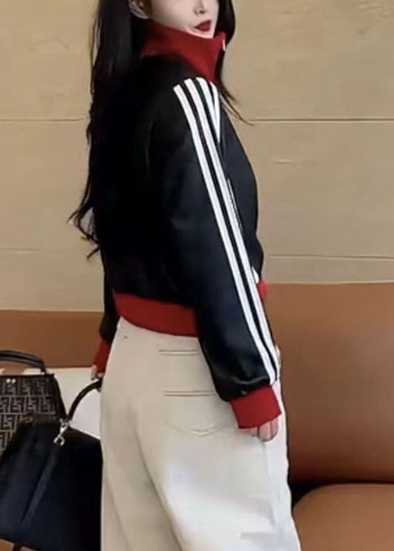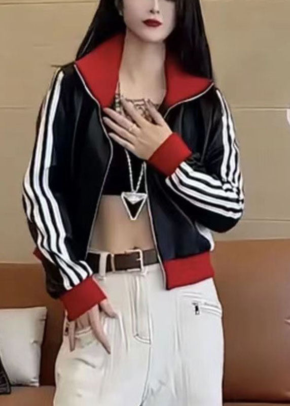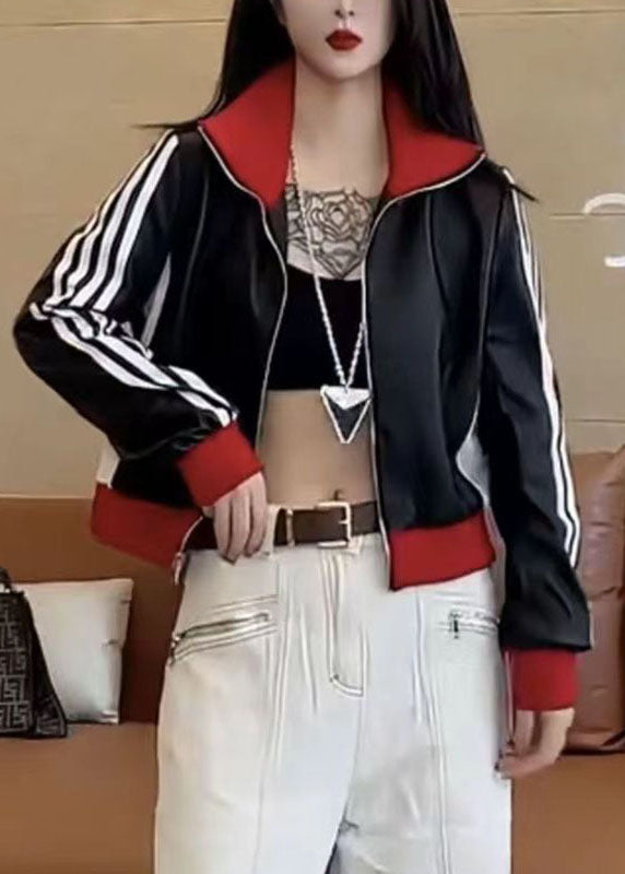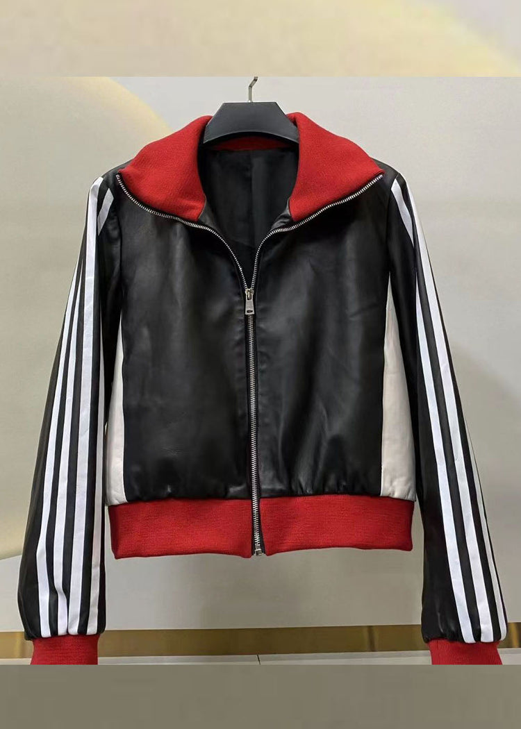 French Black Turtleneck Zippered Patchwork Leather Jacket Fall