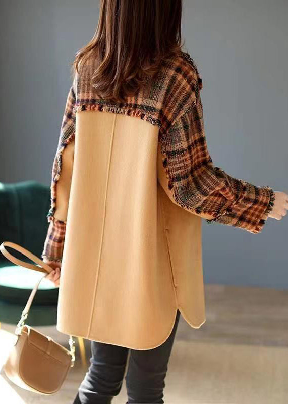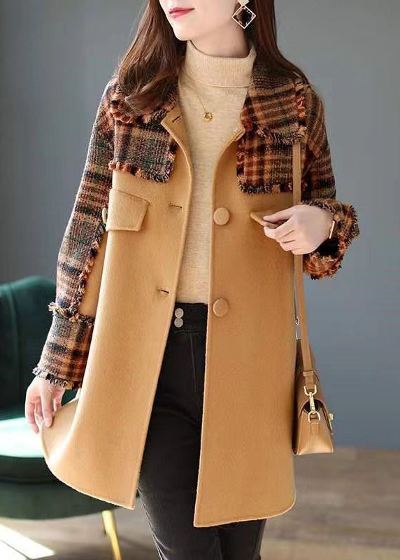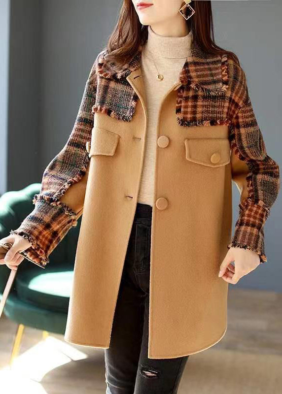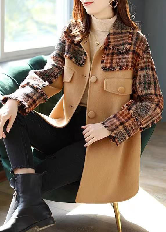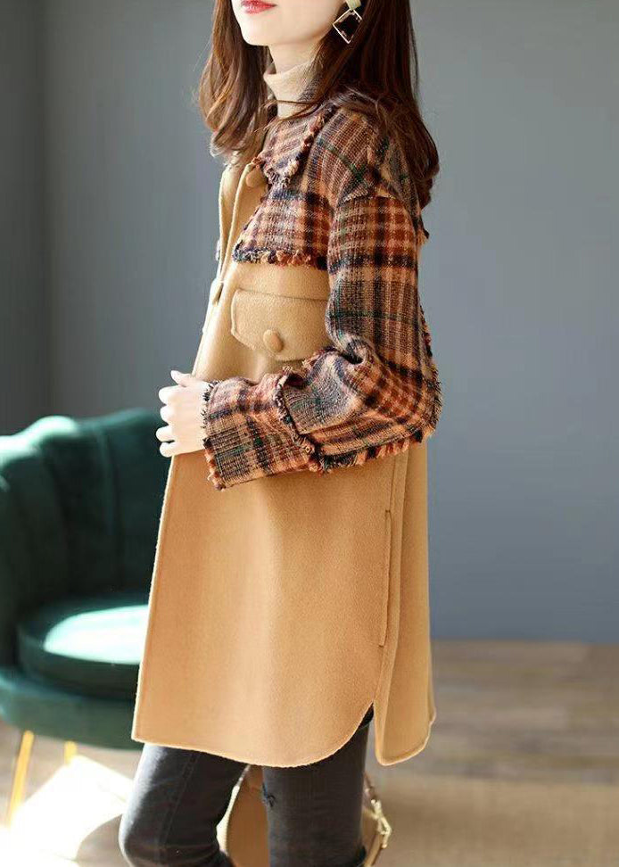 French Camel Plaid Button Patchwork Woolen Coat Winter