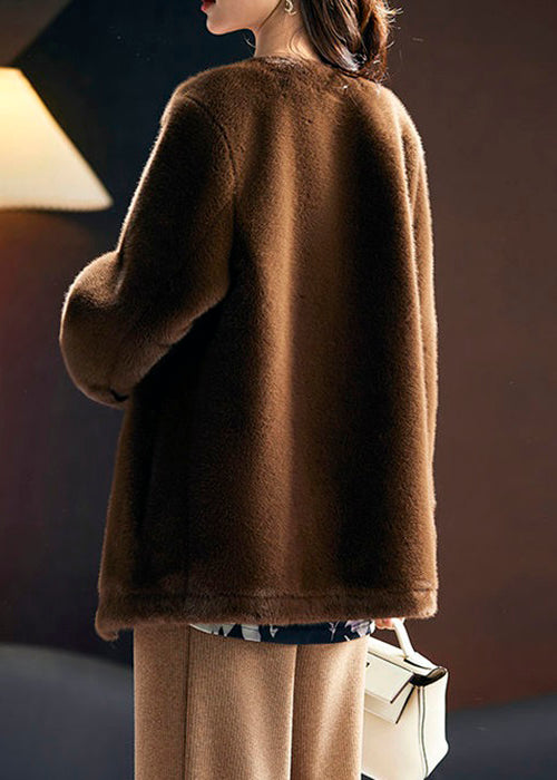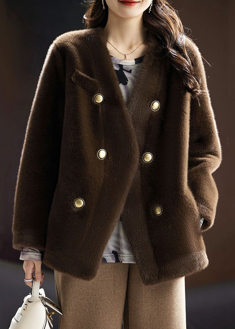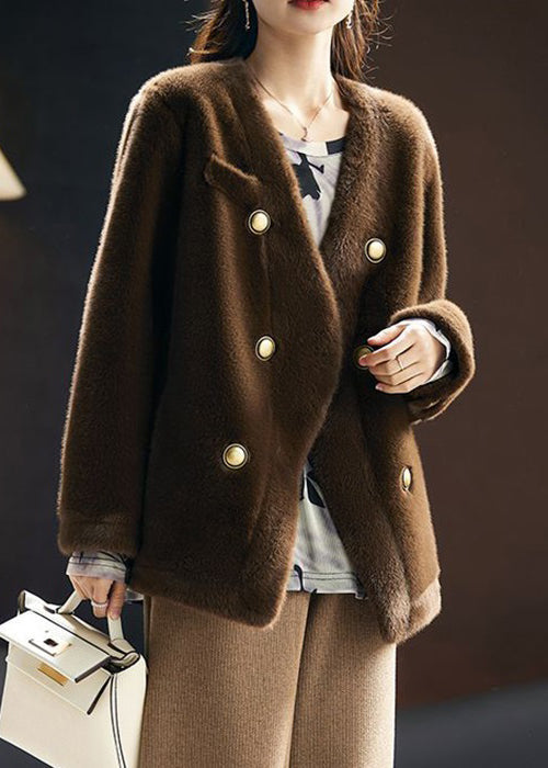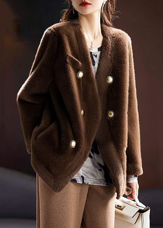 French Coffee V Neck Button Leather And Fur Coats Long Sleeve