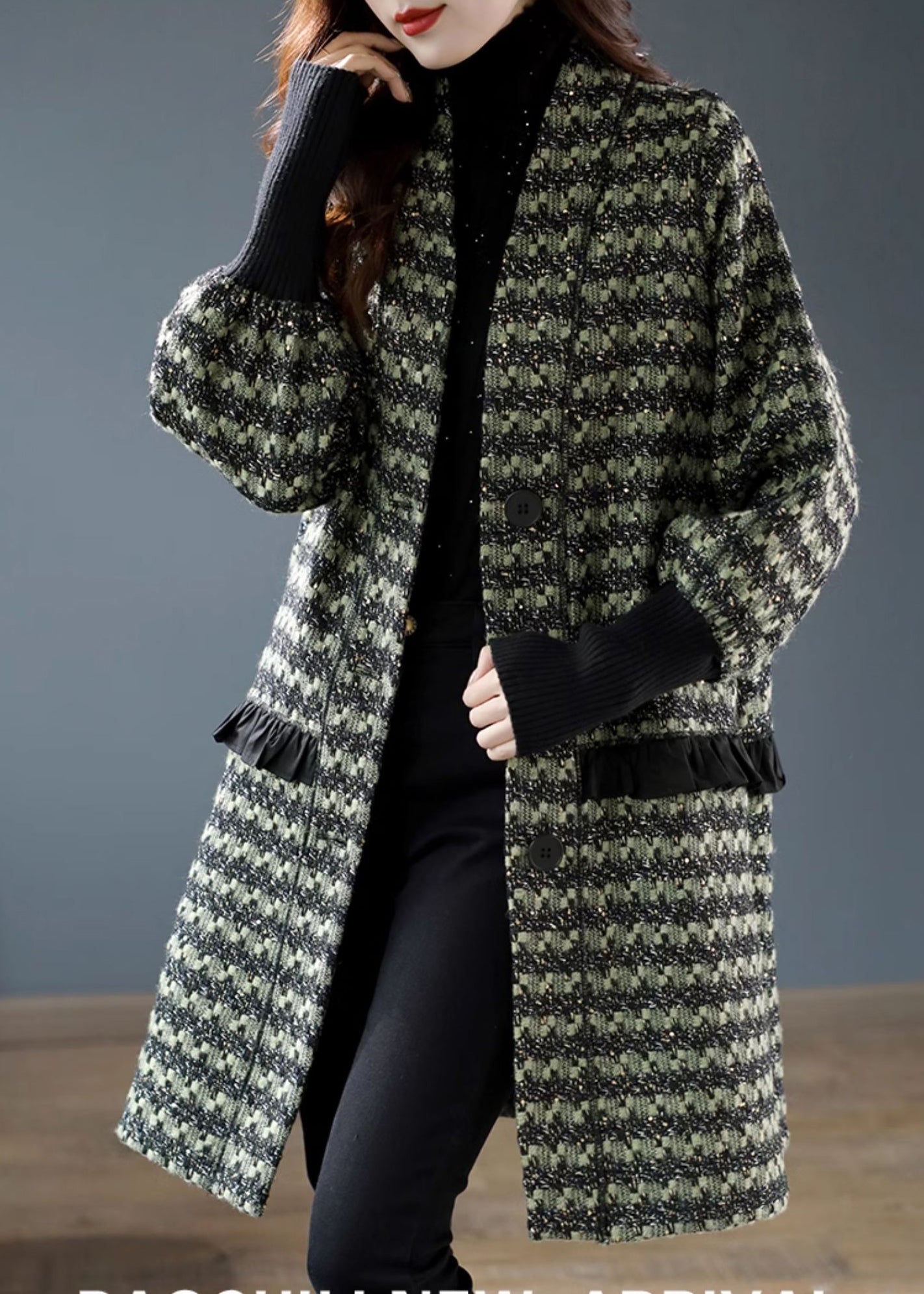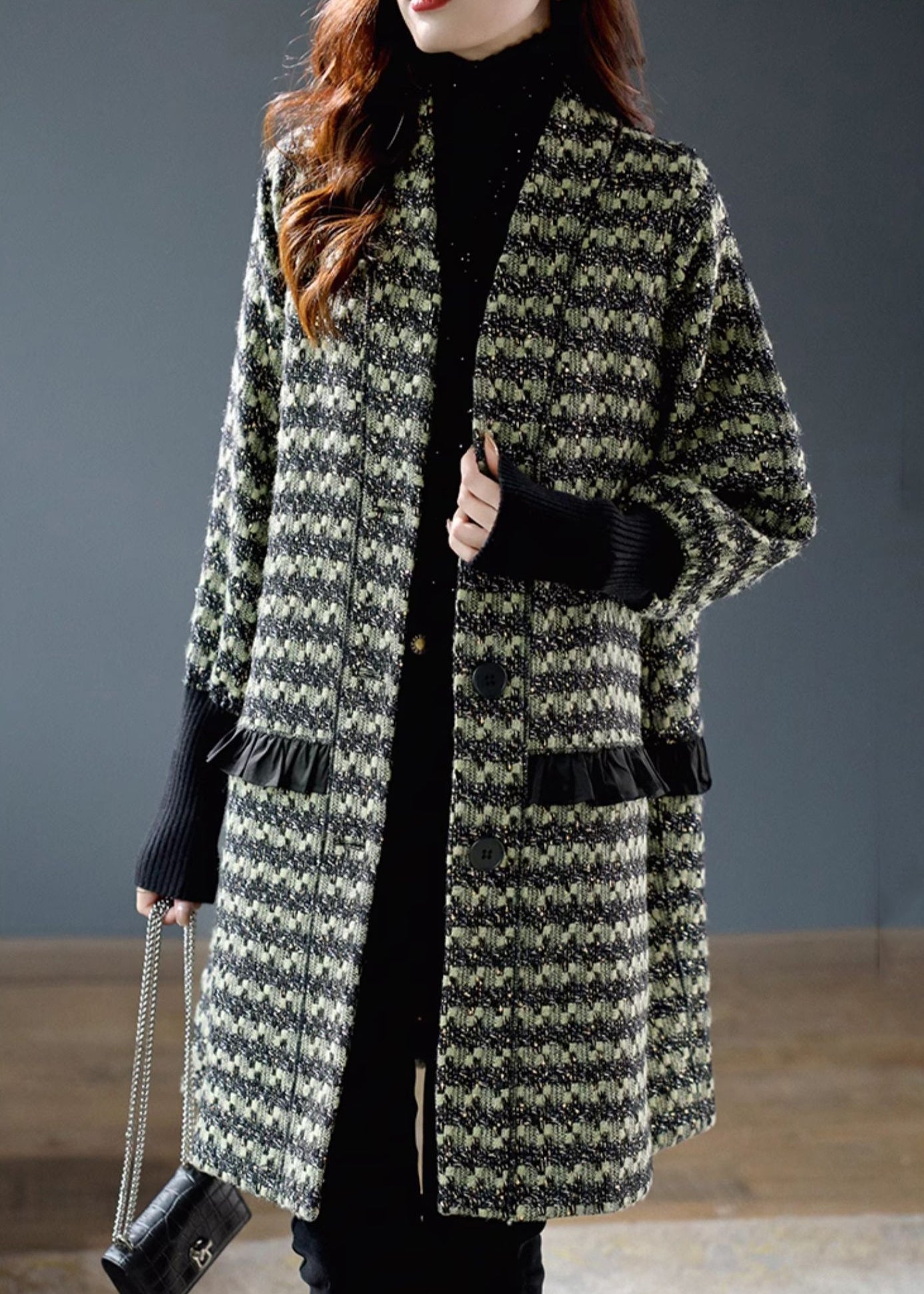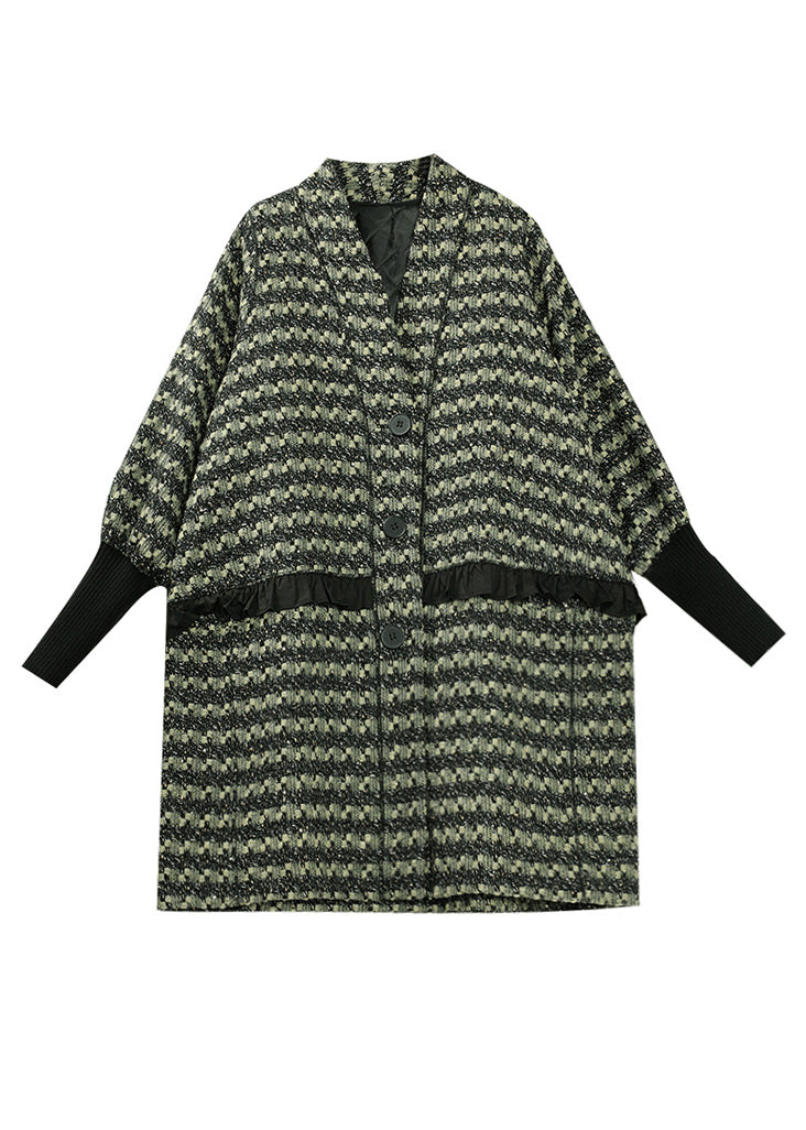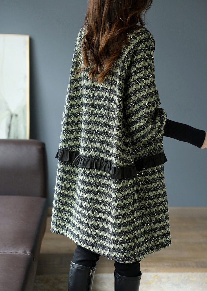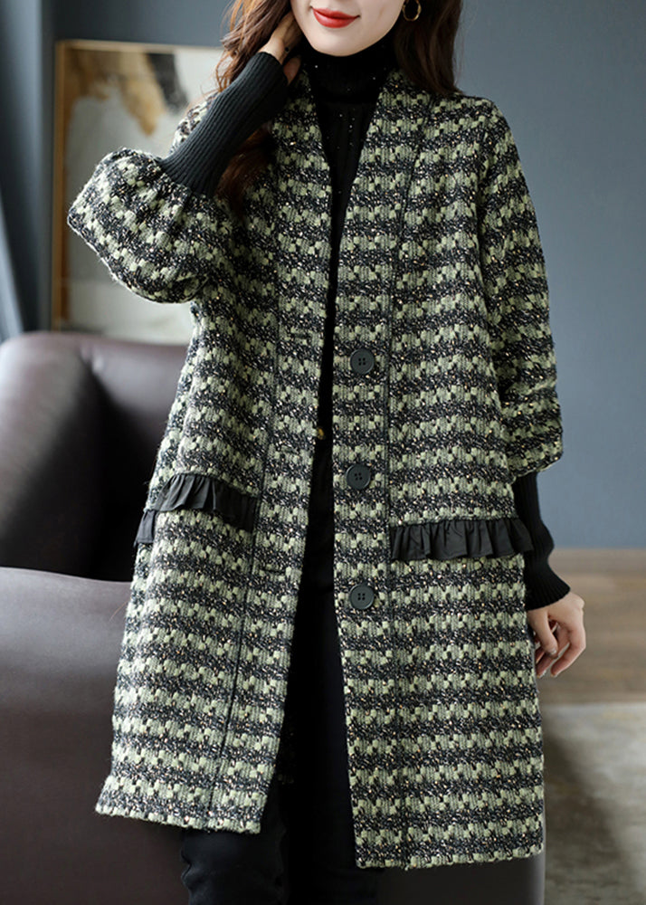 French Green Ruffled Plaid Fine Cotton Filled Woolen Coat Spring