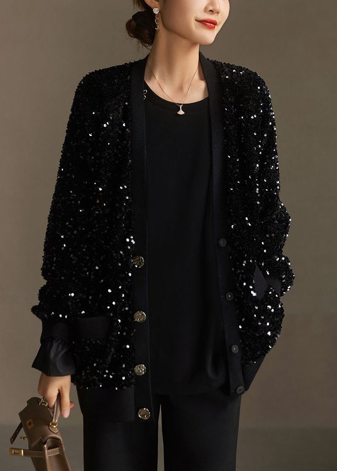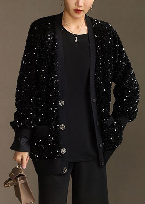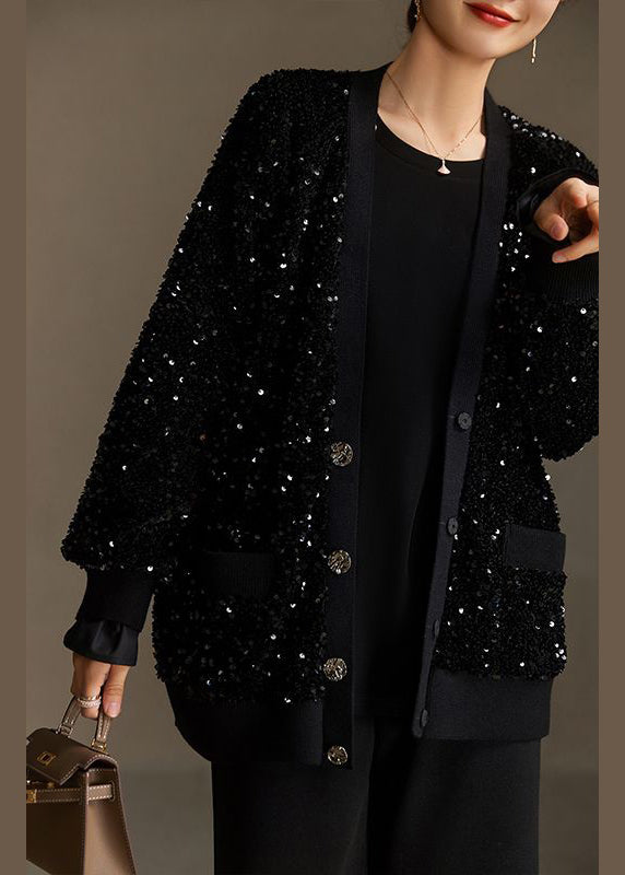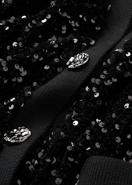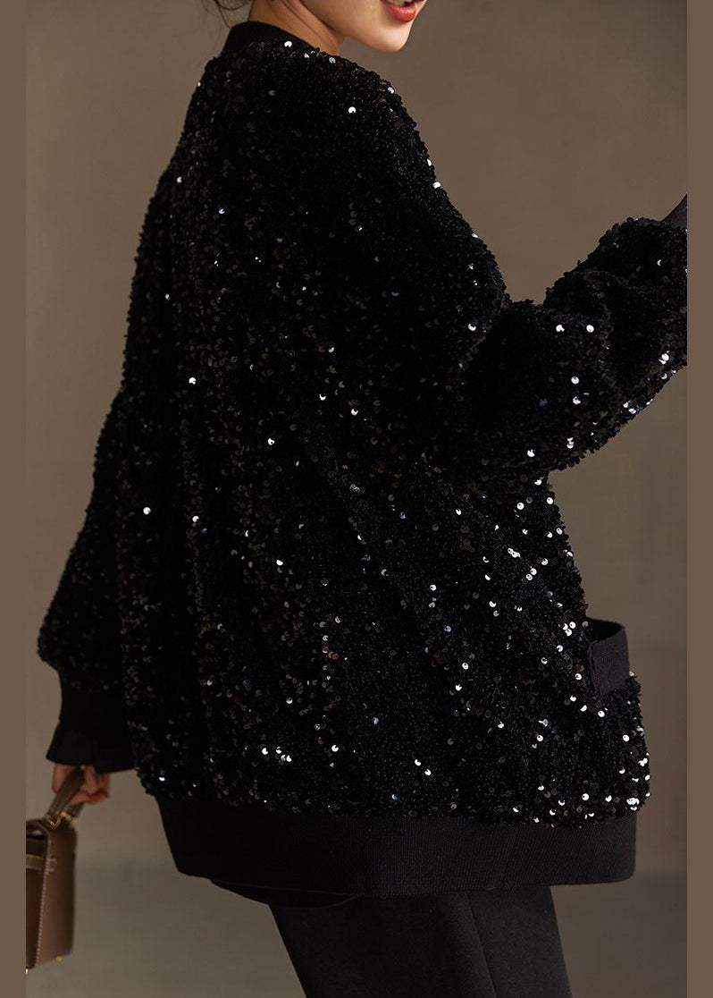 Handmade Black Sequins Button Pockets Cotton Coat Spring
