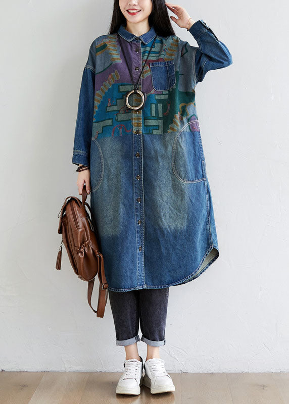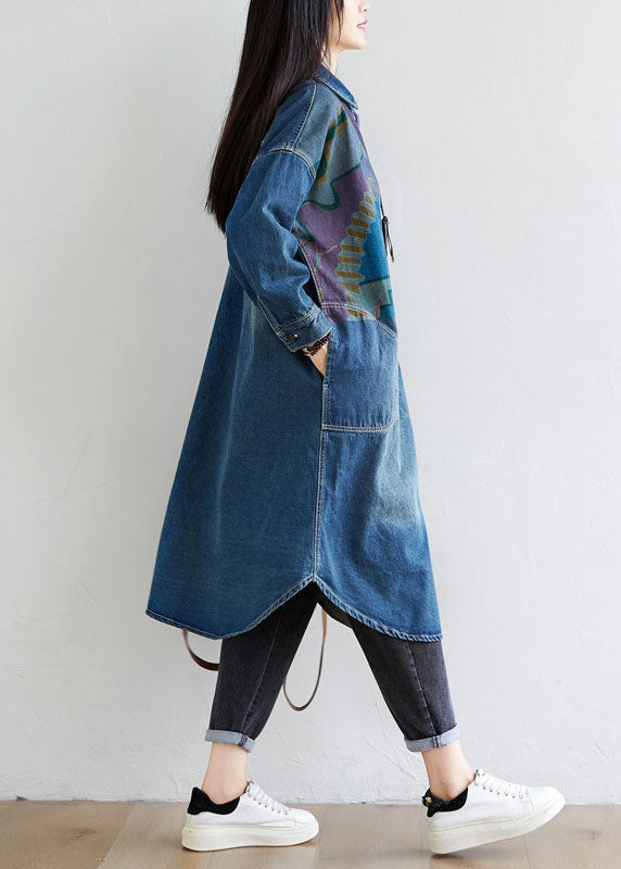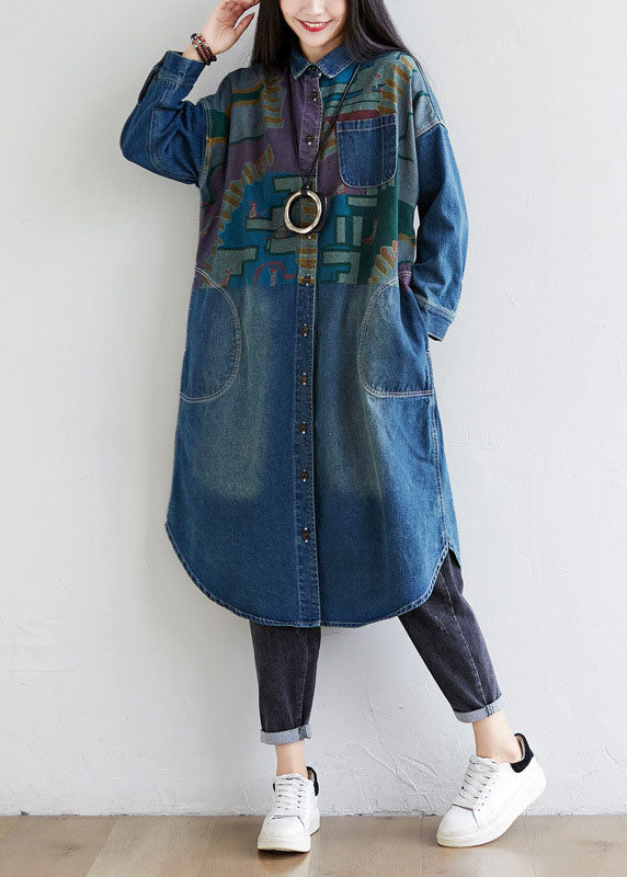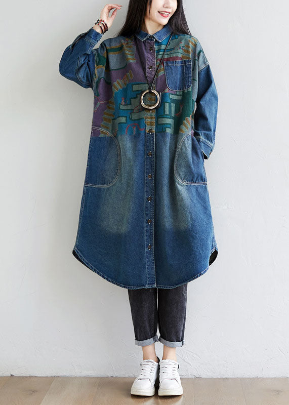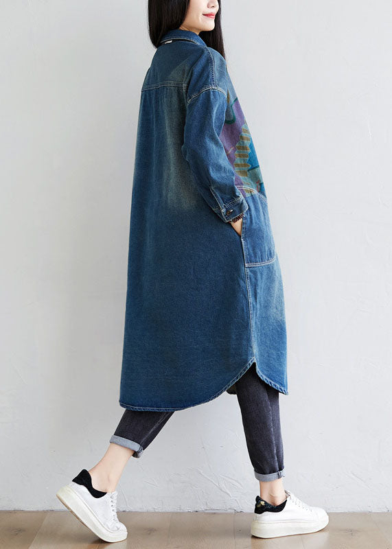 Italian Blue Peter Pan Collar Pockets Print Denim Coat Spring