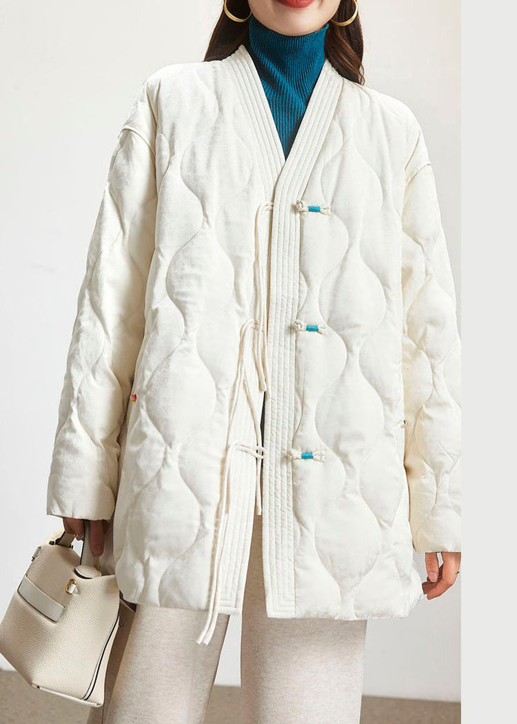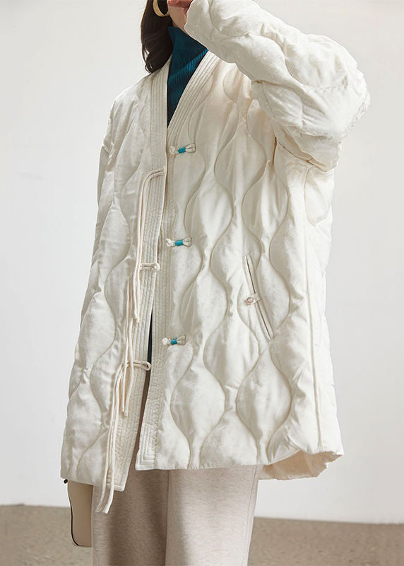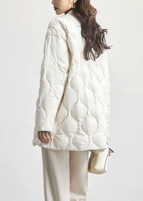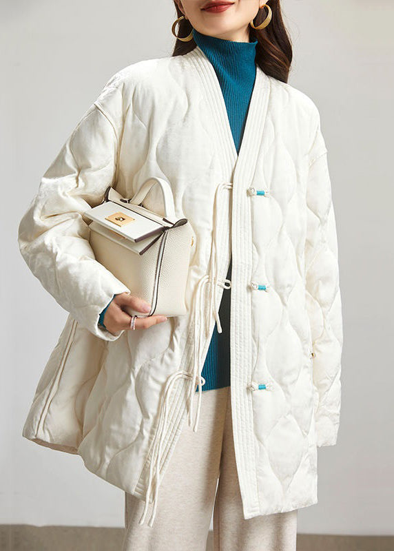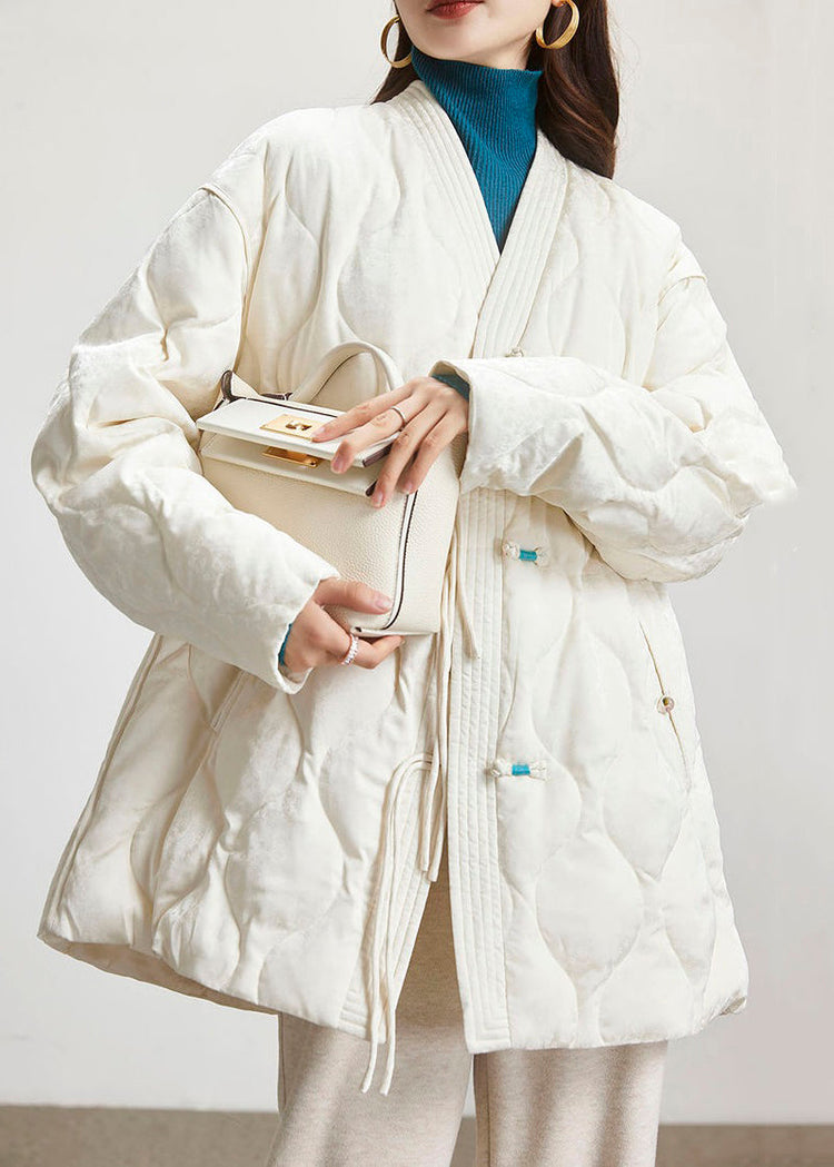 Jacquard Beige V Neck Button Patchwork Duck Down Coat Spring