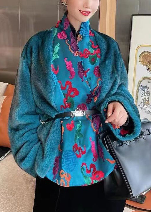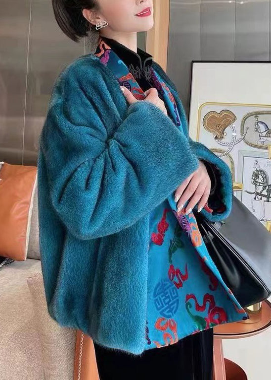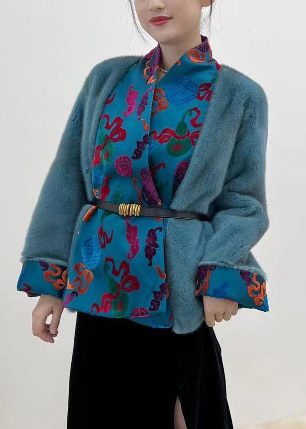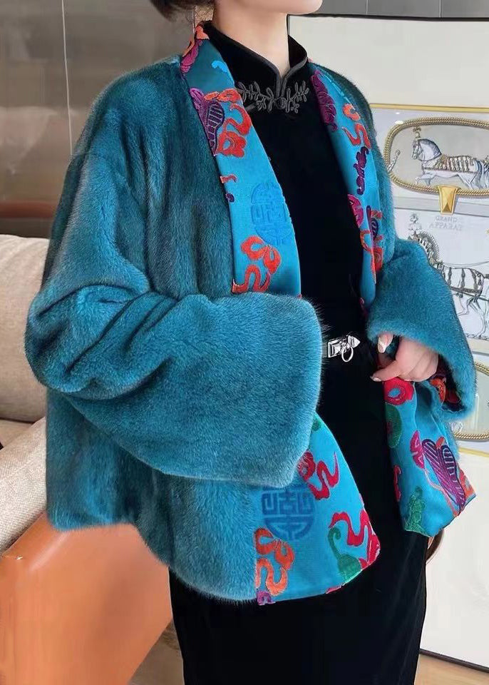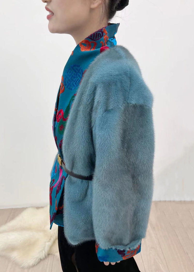 Jacquard Blue Silk Patchwork Mink Hair Coats Long Sleeve
