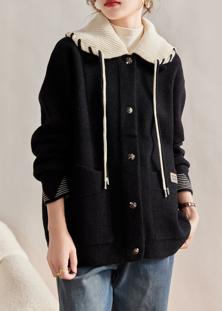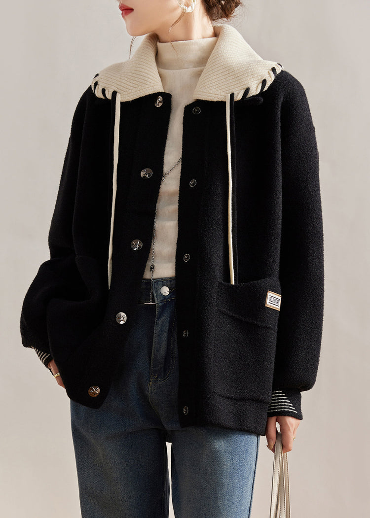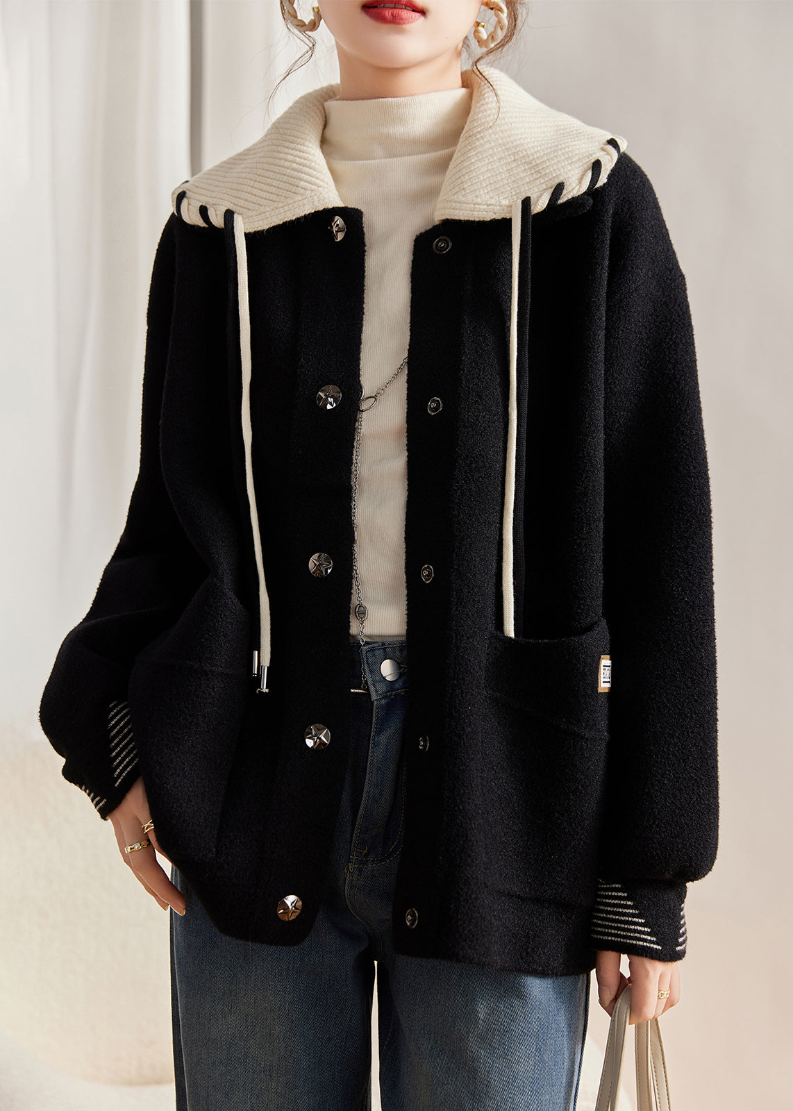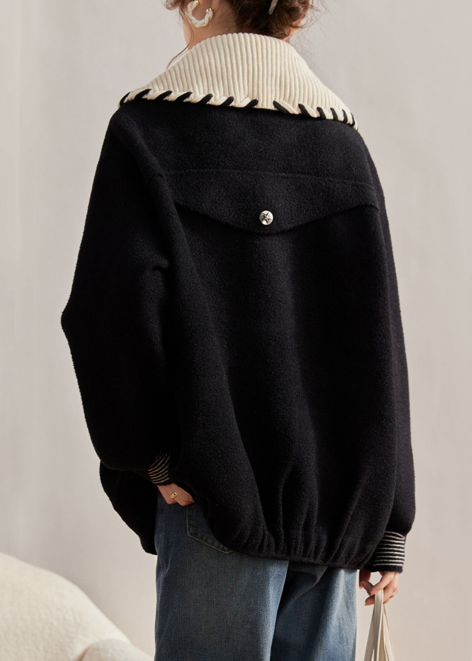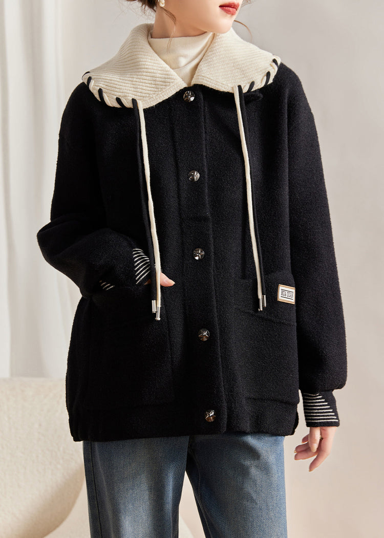 Loose Black Peter Pan Collar Button Pockets Woolen Coats Long Sleeve