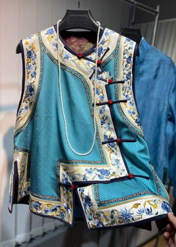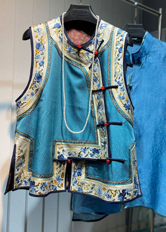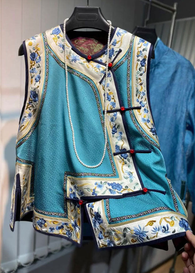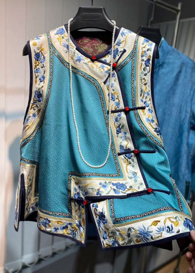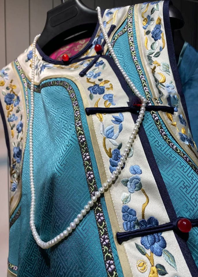 Loose Blue O-Neck Embroideried Floral Patchwork Silk Waistcoat Fall