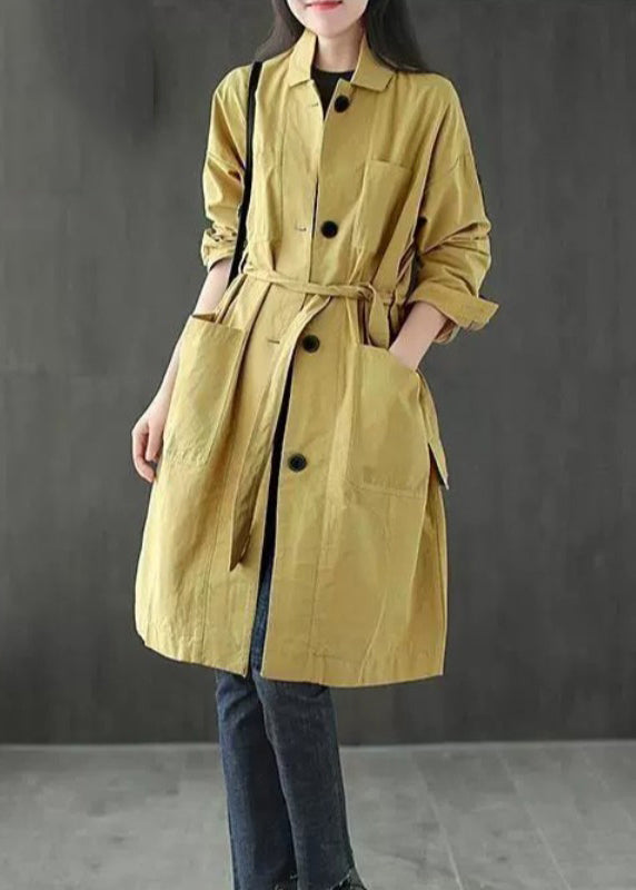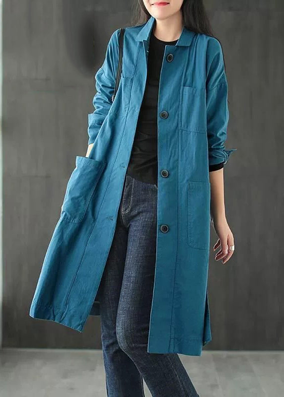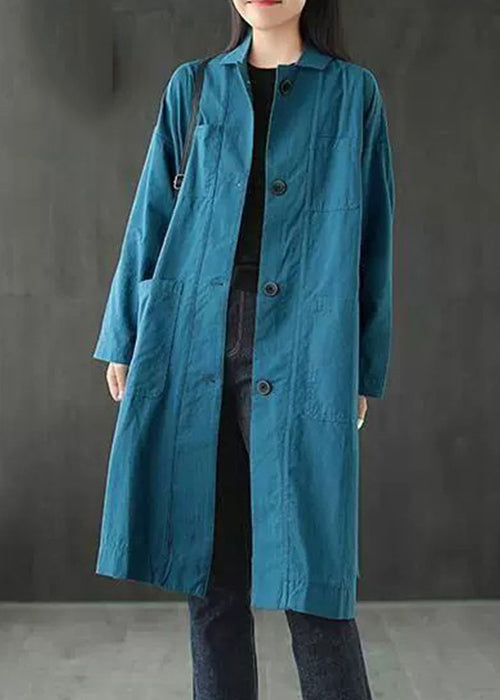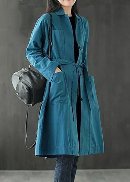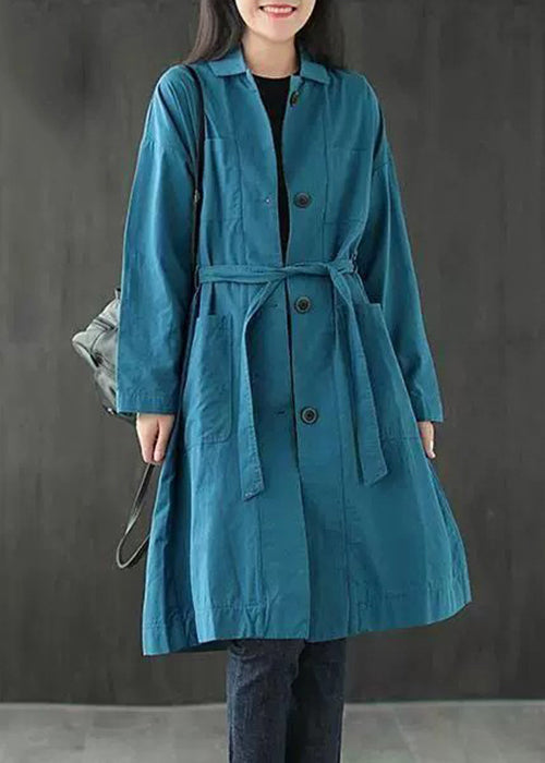 Loose Peacock Blue Button Pockets Tie Waist Cotton Coat Fall
