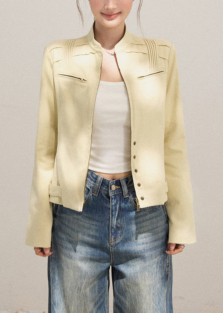 Modern Beige Zippered Wrinkled Cotton Jacket Fall