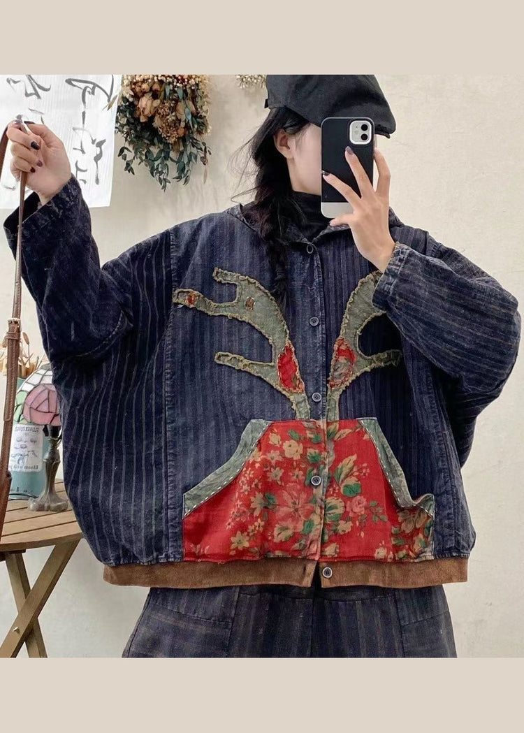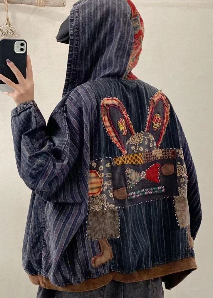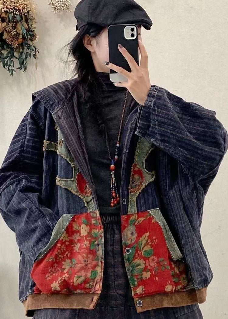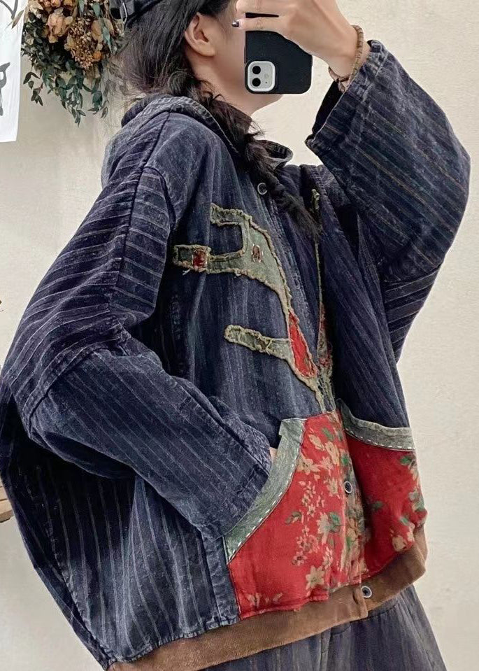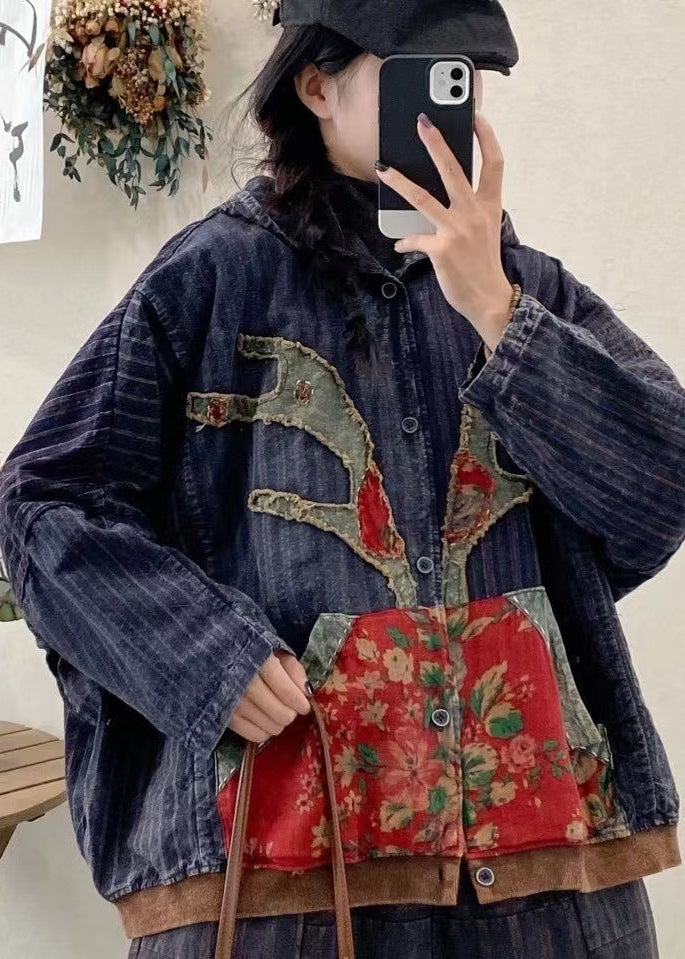 New Blue Pockets Print Patchwork Denim Hooded Coat Fall