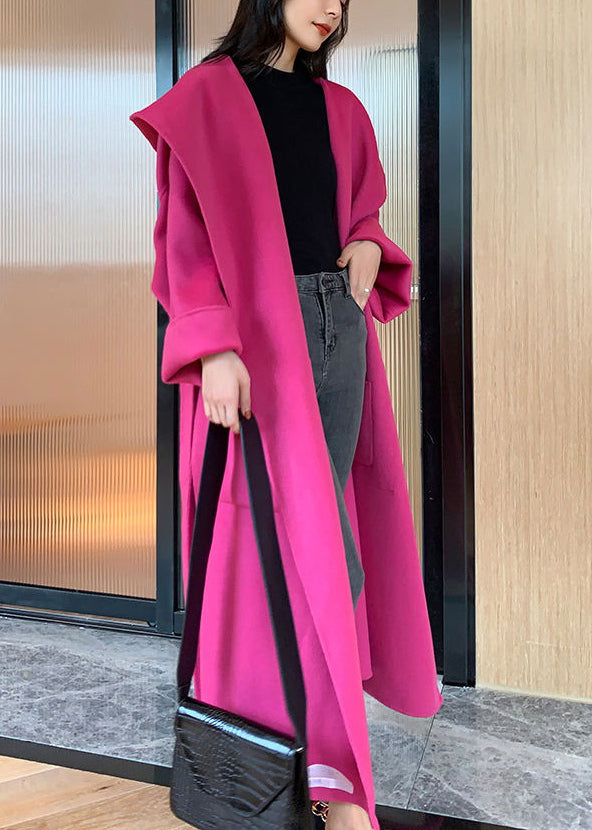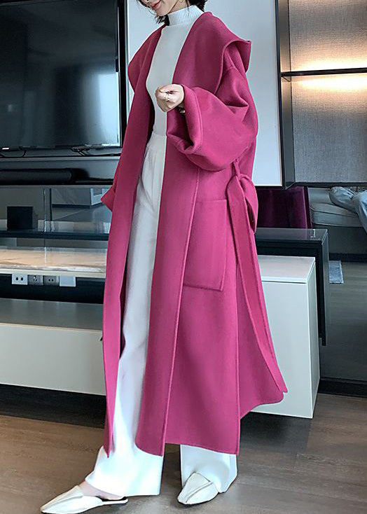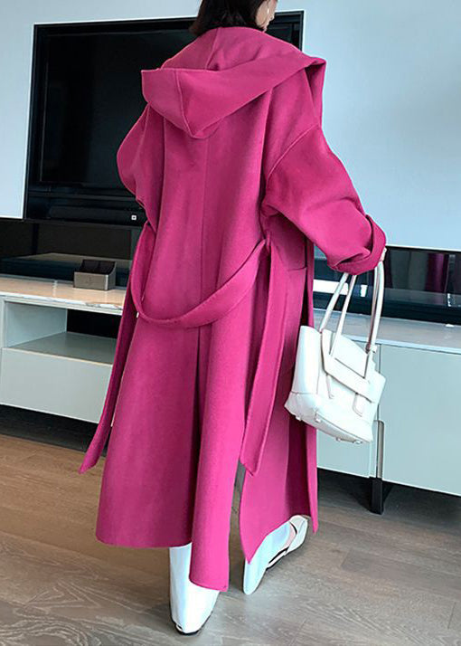New Rose Hooded Pockets Tie Waist Woolen Long Coat Spring
