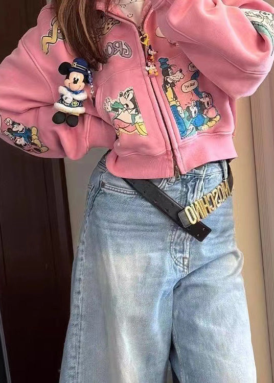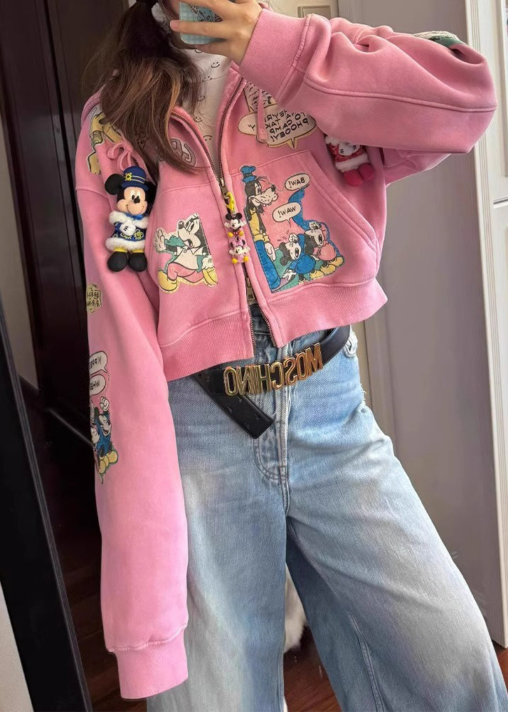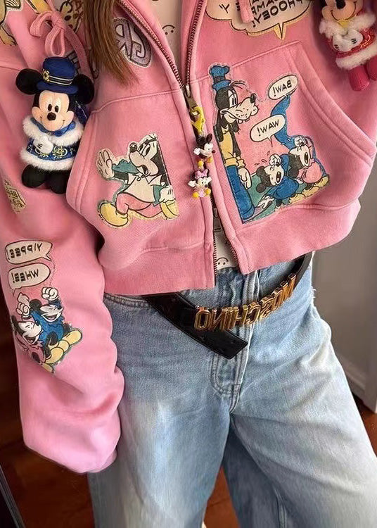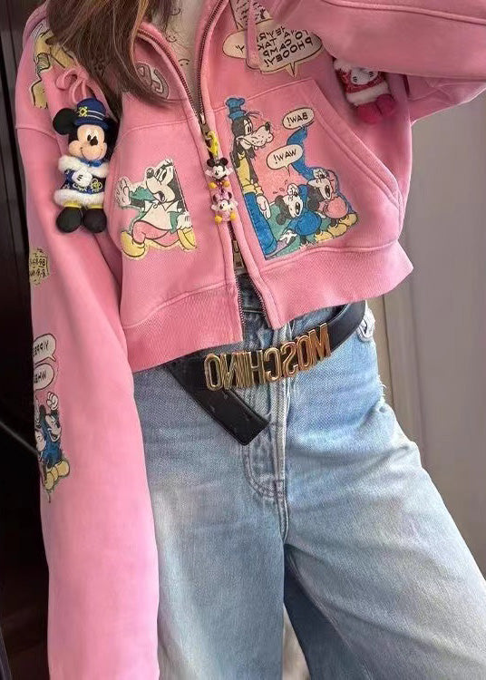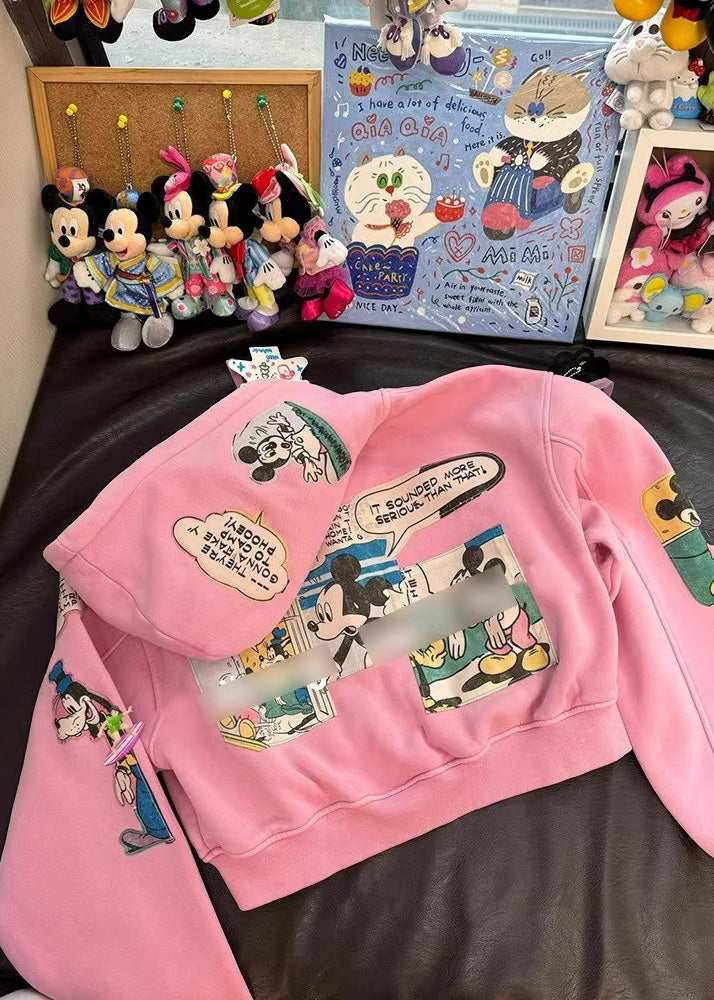 Novelty Pink Oversized Cartoon Print Cotton Hooded Jacket Fall
